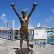 具志堅用高モニュメントは、石垣港離島ターミナルの建物を出た桟橋の方の側。港をバックにして立っています。ここは記念写真の撮影ポイント。具志堅さんは石垣のヒーローですからね。次々観光客がやってきて写真を撮っていきます。