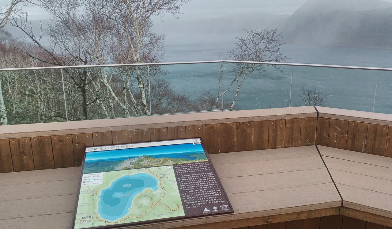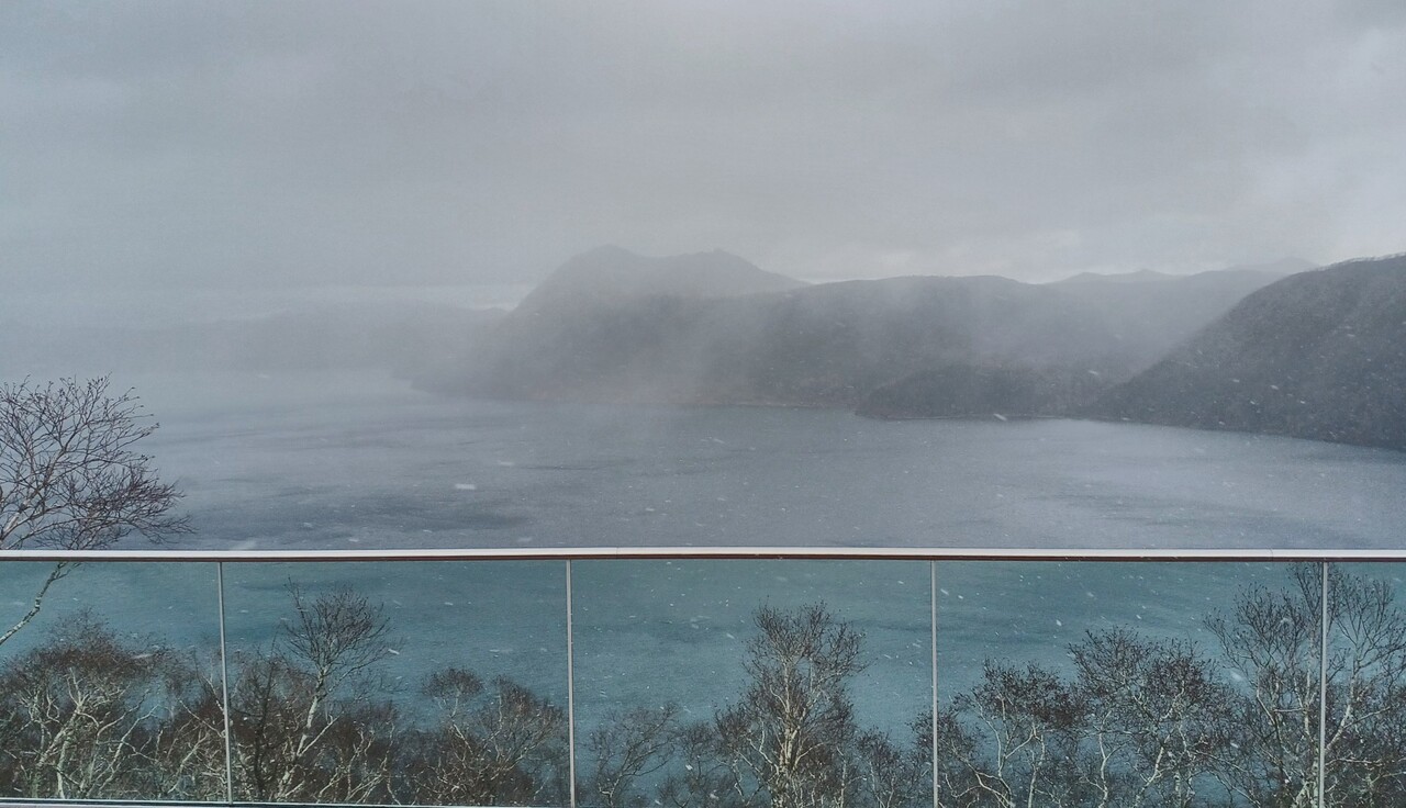 南の方から迂回して第一展望台(カムイテラス)へ。(第三展望台への道は閉鎖中で行けず)。着いた途端に雪と風が。霧の摩周湖とは聞くがその通り。車で少し坂を下ると晴れていたので不思議な気候だった。