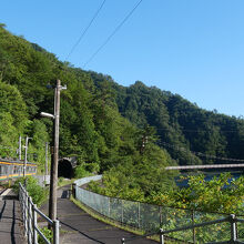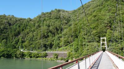 駅周辺の集落はいまだダムのおかげで水没してしまい、人は住んでおらず、湖のような広い天竜川を渡るつり橋が目立ちます。