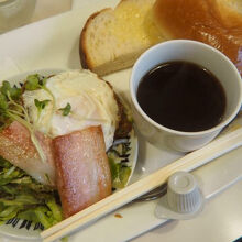 トースト、ベーコンエッグ、サラダ、フルーツ、コーヒーから成る。