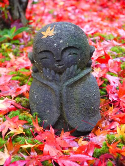 <三千院の小さなお地蔵さん>初秋の京都 紅葉の見頃には少し早い時期でした。どしゃ降りでしたが、色づき始めた紅葉は雨でしっとり...