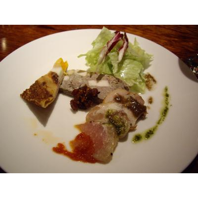 デザートみたいに軽くて、甘く溶ける感じのフォアグラのムースに始まり、ホタテときのこのテリーヌ、ムール貝のグラタン、人参・カニ・カリフラワーの前菜、それから豚足、自家製生ハム、ポークの詰め物、ガレット、 メインは、マダイ、ソイ、アマダイ。どの魚も、ふんわりとその新鮮さが分かる日の入れ具合で一切れ一切れが、美味しかったです。