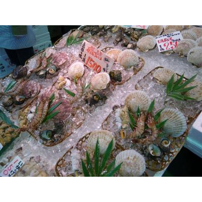 とれとれセンターの中に入っていくとたくさんの魚屋さんが並んでいます。中央付近にはテーブルとイス席が在り、そこで食事が出来るんです。私たちはまず、お寿司屋さんで生ビールとボタンエビのおすしを買ってきました。次に隣りの魚屋さんで生牡蠣とつぶ貝の付け焼きとお刺身セットを・・・続けて赤なまこ、鯖寿司、ビールと。満足の旅でした。合計2人で4500円くらい
