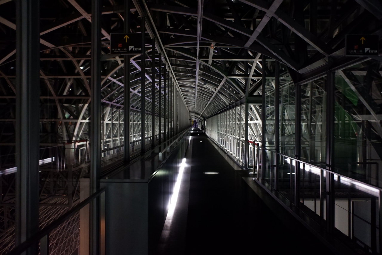 「京都駅ビル空中径路」は、駅ビルの最上部分をホームに沿うように設けられています。途中には展望スペースもあり、京都タワーの絶景ポイントもあります。平日の夜という事もあってか、人の姿はほとんどありませんでした。西側の大階段などに比べて、穴場スポットという印象です。