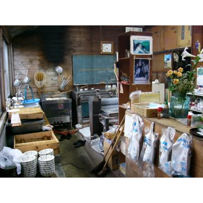 店内を覗いても誰も居らず、人の気配すらないのですが、うどんを茹でる釜や丼が置いてあるので、ここはうどん屋だということがわかります。