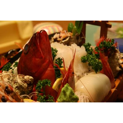 舟盛てんこもり、金目の煮付け、揚げ物、鯛しゃぶ、伊勢エビ(多分)の半身のグラタン、サザエのつぼ焼き、その他諸々の夕食。