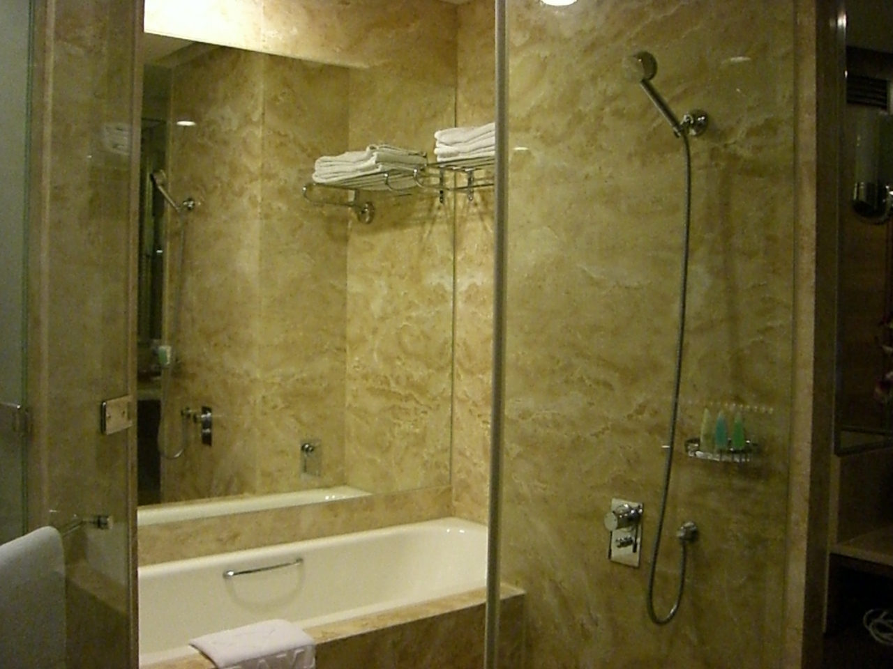 バスルームはシャワーが2つ。普通のホースがあるタイプと、天井についているタイプ(よくプールにあるようなシャワー)。洗面所も広いし満足♪