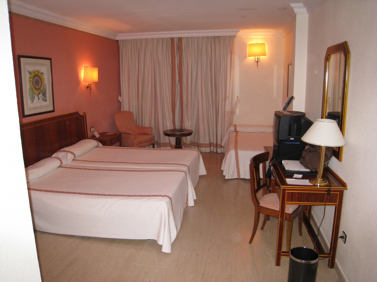 部屋は1階の中庭に面した部屋で、とても広くベッドが3つありました。設備等は古さを感じました。また、ホテルに着いた時間も遅かったせいもあり、部屋は暗い感じがしました。ホテルの敷地面積は広く、全体的にゆったりとした造りになっていました。