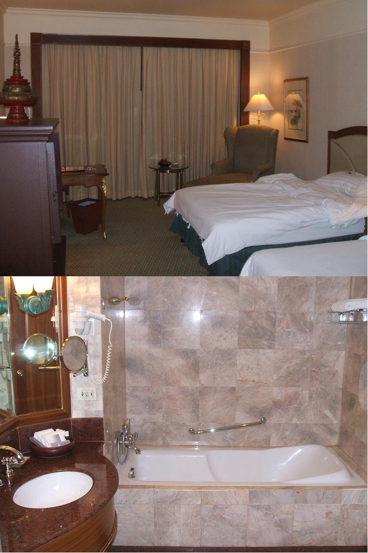 部屋は広いし、ベッドは(セミ)ダブル2台のツイン。シャワーブースも別。ウェルカムフルーツに読売新聞衛星版まで付いてました。