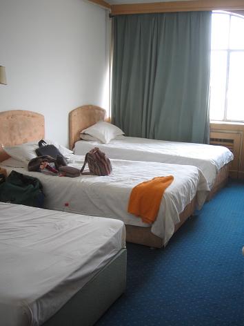 ここの別館に、ドミトリーがあり、普通のホテルの部屋を3人で共同で使うところがある。35元と50元の部屋を見せてもらい、どちらもそんなにかわらなかったのだけど、50元の方はホットシャワーが24時間使えるらしいので、そちらにした。バスルームはとってもきれいでタオルもあり、ベッドもふかふか!これはかなりお得。
