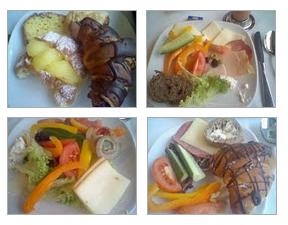 CookedFoodはゆで卵しかない。種類は普通、パン数種、甘いパン数種、フルーツ数種、トマト、サラダ、オレンジと黄色ピーマン、きゅうりの野菜類、ゆで卵、ディップ類、シリアル類、ハム4種、チーズ4種、コーヒー紅茶とジュース4種。