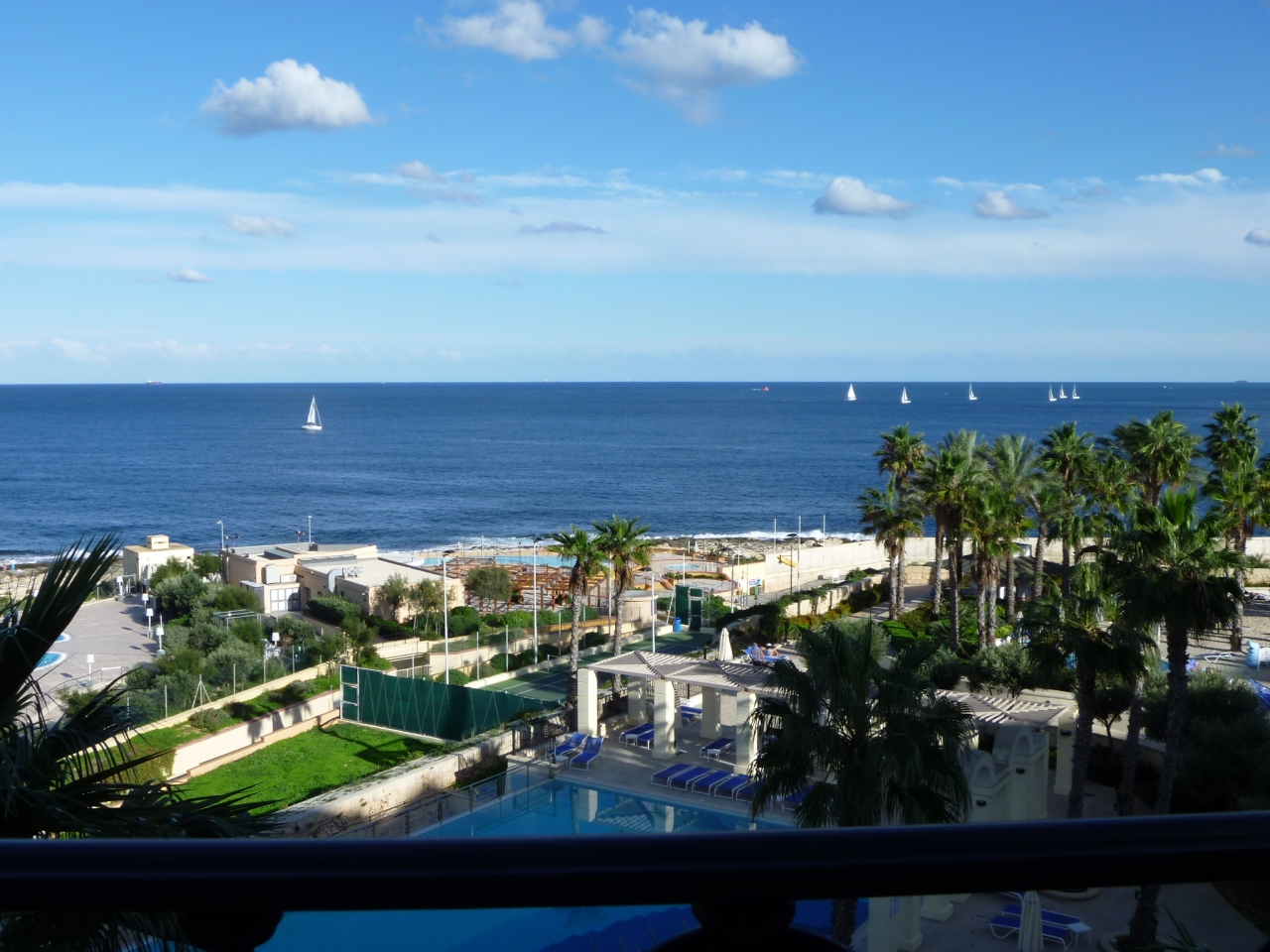 マルタのホテルでは候補が3個所ありました。?フェニキア?メリディアン?ヒルトンです。でも、今回は海を眺めてのんびりしたいというのが第一目的でしたので、ヒルトンにしました。そして、この選択は大正解でした。オーシャンビューの部屋を予約しましたが、期待以上のものでした。写真は部屋のバルコニーからの眺めです。気にかかったのが観光面のアクセスでしたが、全然問題ありませんでした。バス停が近く、しかも本数が多いので待ち時間はほとんどありません。しかも、すべてヴァレッタ行きですので来たバスに乗ればいいだけです。しかも、ヒルトンがこんなに低価格とは。アップルで3泊予約しましたが、最初金額を見た時に1泊料金と勘違いした程です。周辺は美味しいレストランが沢山あり、すべての面でとても満足のいくものでした。