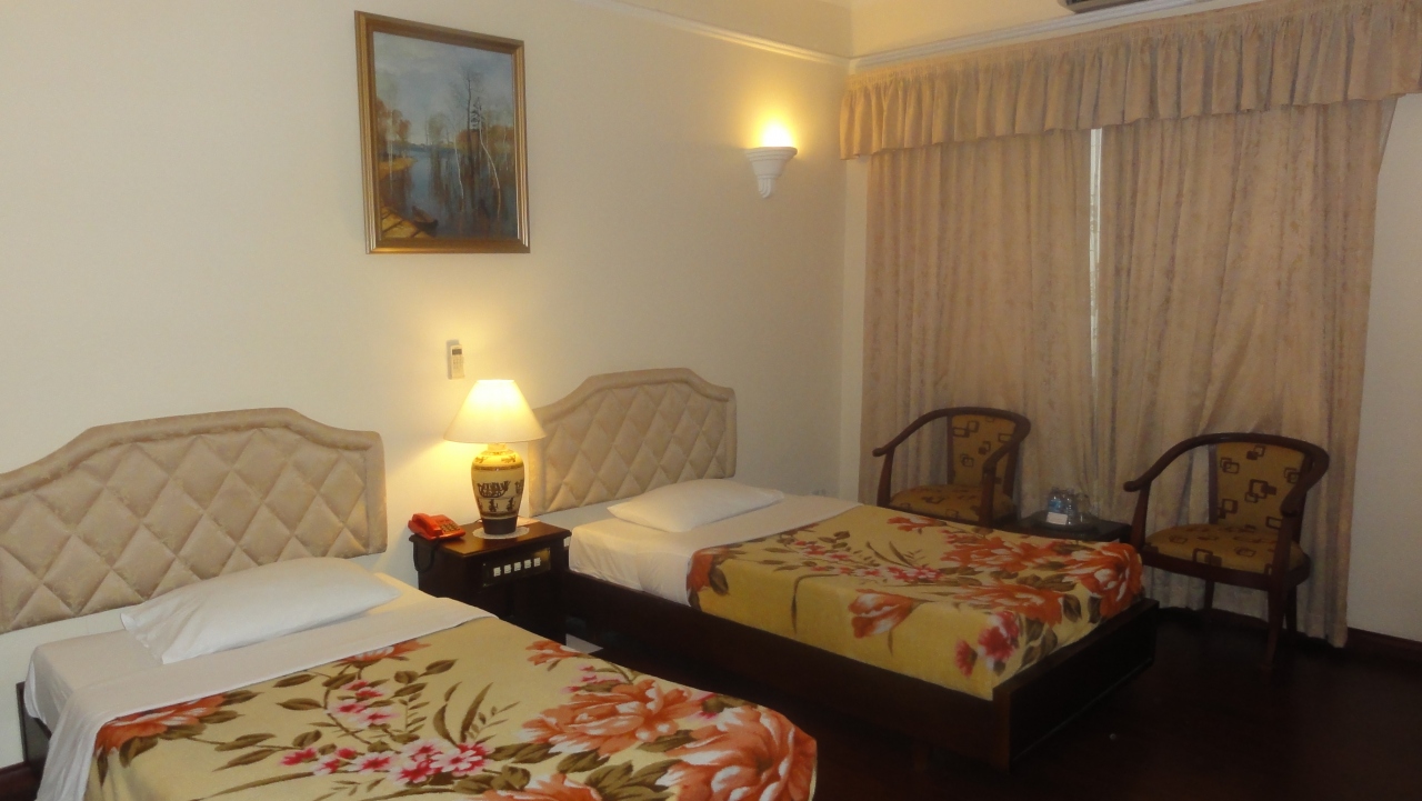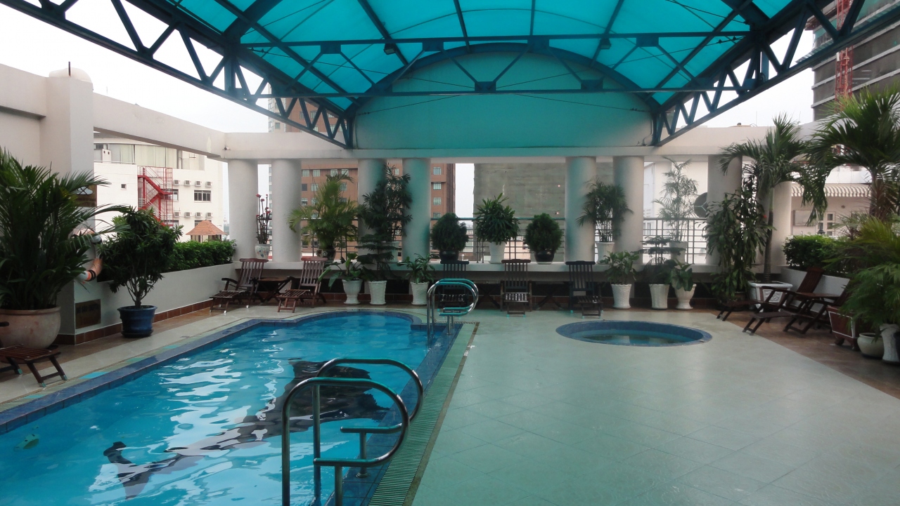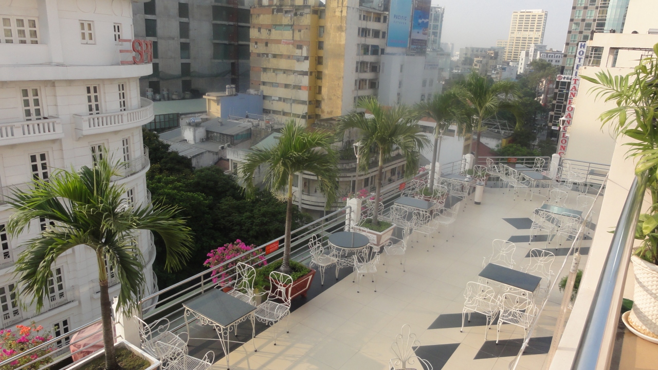 とにかくロケーションの良さはドンコイ通りに面していて、ショッピングなどでも好都合、とても便利です。一階は中国的ではありますが、ホテルとして特に問題ありません。ロビーではインターネットが無料で使えます。受付はまず普通の対応です。客室はまずまずですが外に面していない部屋はほとんど何も見えません。クーラーはしっかりきいています。むろん冷蔵庫はあります。朝食は上でとりますが、眺めが良く気持ちよいです。素晴らしい朝食というようなものではありません。フォーは頼めば作ってくれます。プールが屋上にありますが15mくらいの水浴び用(深いですが)です。その横にある写真の場所がこのホテルのランクにしてはなかなか素敵で、サイゴンの町を眺めながら一杯夕方やるのは贅沢な気分になります。サウナも屋上にありますが、普通のサウナで怪しいものではないようです。