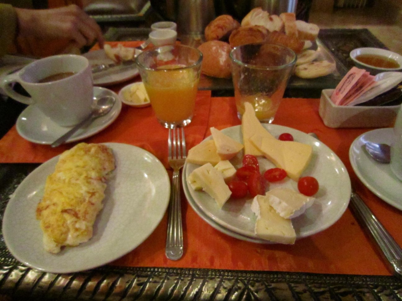 クロワッサンやパリパリのフランスパン、他何種類かのパンと絞りたてのオレンジジュース。コーヒーにおかずを一種類選べる。種類は多くは無いけどパンに付けるはちみつとバターが最高に美味しかった!