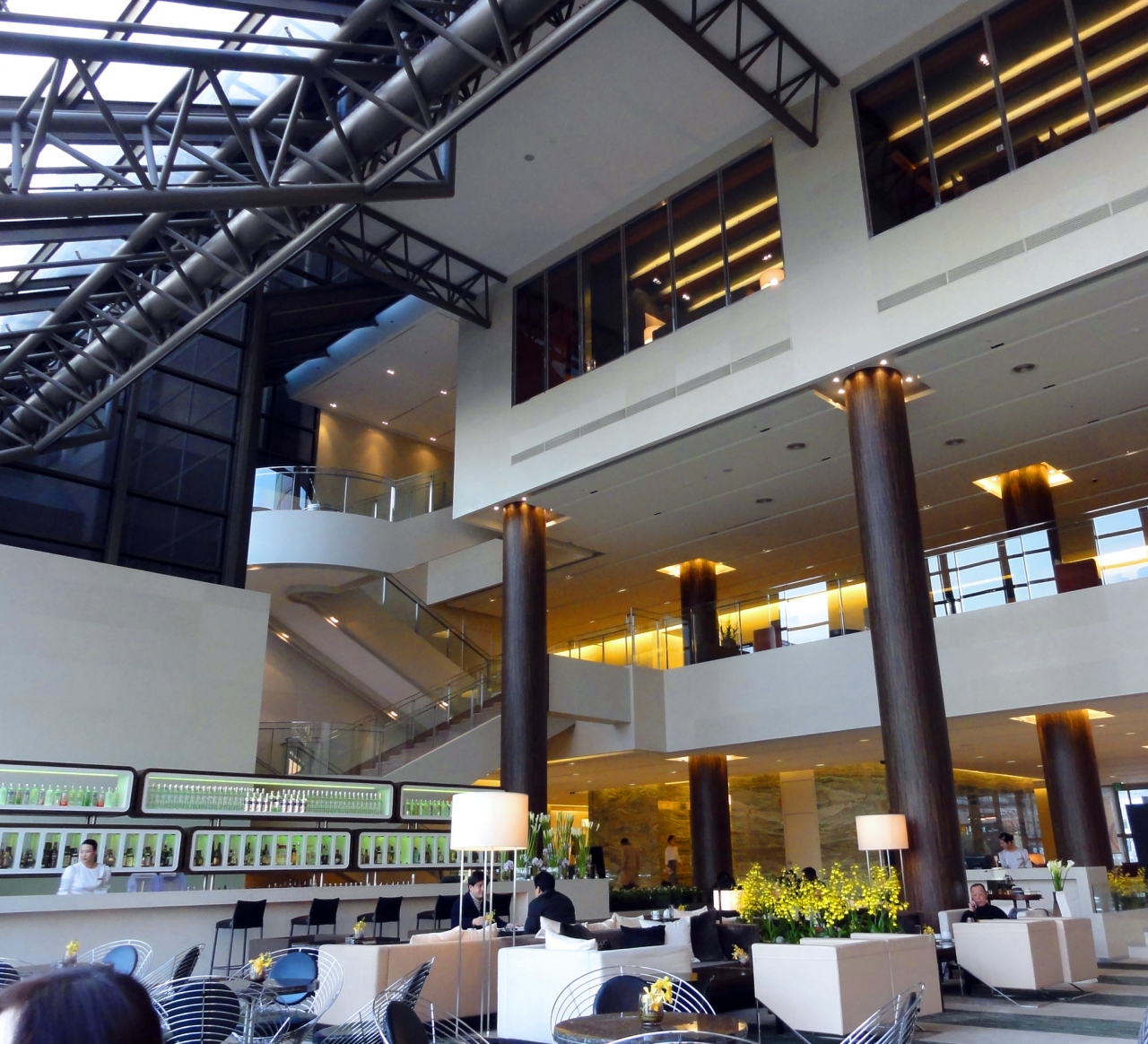 内装も落ち着いていて、いい感じ。海はみえないけど、今回は価格重視の節約旅行。納得の内容でした。インターネットが有料なのがちょっと残念。アメニティーは充実しています。新館の1Fロビーでウエルカムドリンク券を使って一休み。感じの良いロビーで、ソファーも高級感があります。今回はここでも日本人らしき人はいませんでした。(3月だったから?)ホテルの目の前のビーチを散歩。とても綺麗な砂浜です。ホテルの部屋にもどって、新館4Fの露天風呂へ。受付でロッカーキーとバスタオルをもらい。まずは更衣室で水着に着替えます。結構狭い更衣室です。(プールの更衣室の様な感じ)裸足で更衣室を出て、外の出口のドアを空け、デッキを通って露天風呂に到着。隣がプールになっています。高温と低温の露天風呂が2ヶ所づつ計4ヶ所あり、低温のお風呂は温すぎて入れません。高温のお風呂はちょっと熱すぎ。想像していてたよりこじんまりしていました。まあ無料なので問題なし。