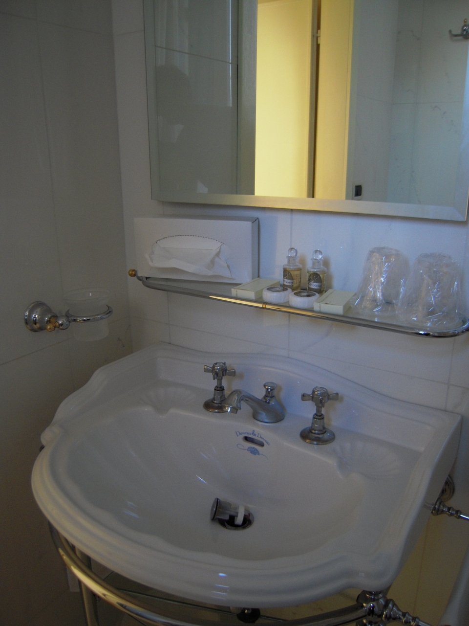 部屋はとても明るく、ローマ広場を望める位置にあります。朝は、貨物運搬用の船が運河を行き来するのが見れます。バスルームはとても女性が喜びそうな猫足のバスタブに、おそろいの模様の施された磁器の洗面台やトイレ(水を流すときは、上にあるタンクから流れる仕組みになってて、紐をひっぱります)があります。アメニティもそろっています。