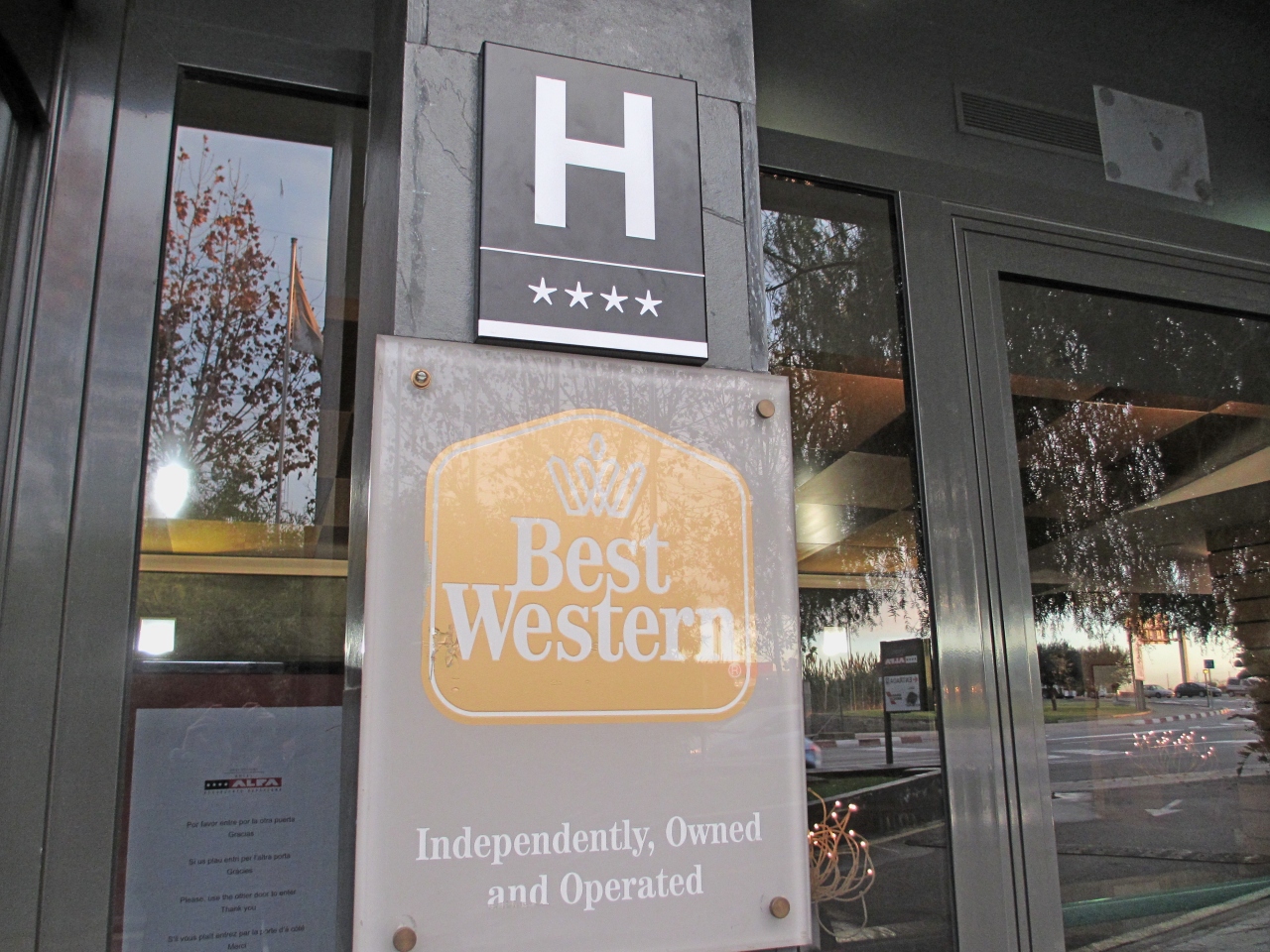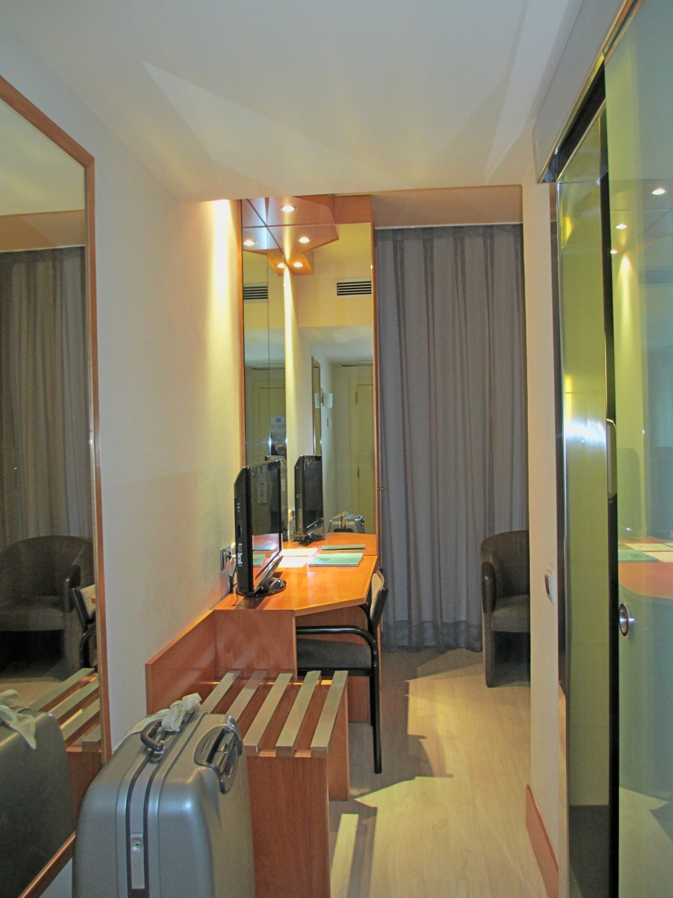 けっこう空港から距離がある.ちゃんと来て5km,私たちのタクシーは高速経由の遠回りで7.6km.シャトルミニバスがあるが,ホームページには待ち合わせ場所が明確に書いて無くわかりにくい.呼んだが,待ち合わせ場所を間違えて,結局乗れなかった.次のバスまで40分後と言われやむなくタクシーに.これなら市内でもいいくらいだった.ここまで18ユーロ,市内までも35ユーロで行く.周りは倉庫街で何もない.このホテル,はっきり言って泊まらないほうがいい.部屋は狭く,シャワーの水の出は悪く,ぬるい.同伴者の部屋は空調が故障して寒かったと.部屋は三ツ星並み.しかし朝の食事は四つ星並みだった.