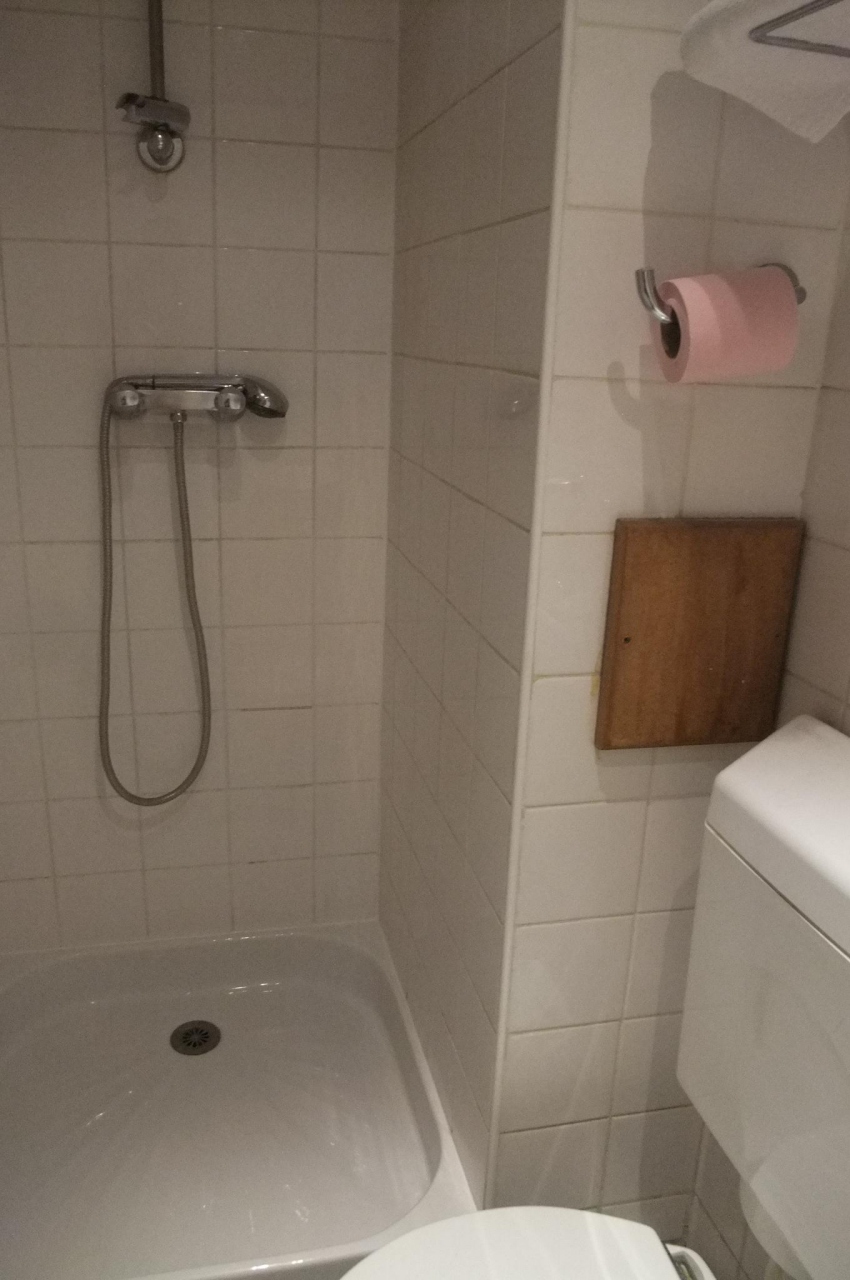 イタリア・ローマの駅前に泊まった時も狭いと思ったけど、あちらは★の数が3つだったから、もう少し広かったシャワー室。