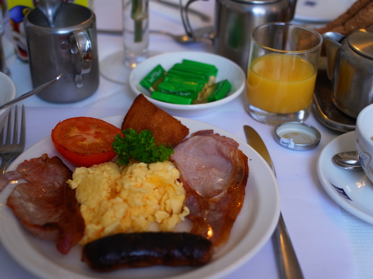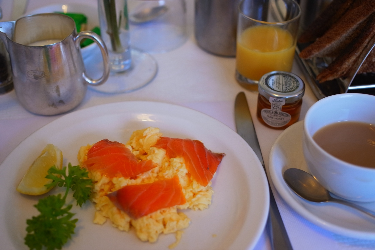 この宿で最も特筆すべきことは、なんといっても最高の朝食です。フル・イングリッシュブレックファストが料金に含まれており、これが本当においしいです。メニューは目玉焼き・スクランブルエッグ・サーモンから選べます。パンも白パン・黒パンが選べ、コールドミール(フレークやスコーン、フルーツ、ヨーグルトなど)のバイキングも利用できます。紅茶ももちろんおいしい。