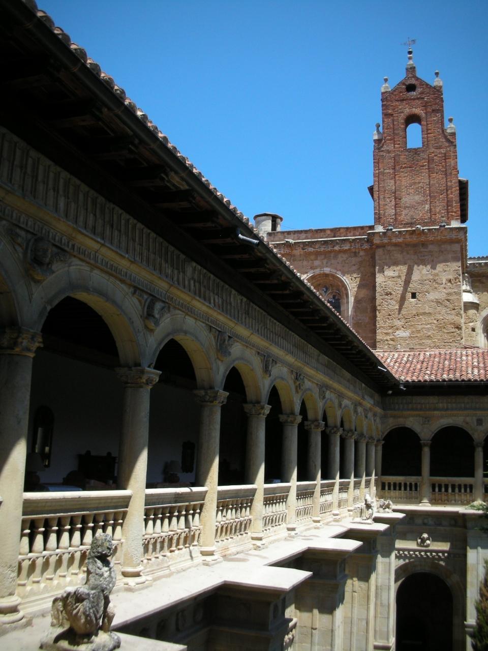 1515年に建設が始まり完成は18世紀の初め、当初はサンティアゴ騎士団が巡礼者のために救護院として建設したものがサン・マルコス修道院となり、現在はパラドールになりました。長さ100mにも及ぶ細工が施された正面外観は、プラテレスコ様式(銀細工のような細かい浮き彫り)と呼ばれるもので、パラドール一美しいと言われる玄関と併せて大変美しかったです。玄関ホールや中庭など内部の造りや、調度品も素晴らしくムード満点です。部屋はスタンダードということもありまあ普通でした。(そもそも、修道院を改装した系のパラドールは、部屋の豪華さを期待するものではないですね。)