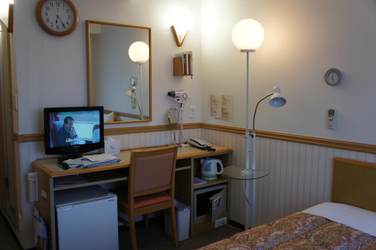 部屋はまさに日本の東横インと同じで、冷蔵庫、ドライヤー、電気ケトル、セーフティーボックス、スリッパがあります。パジャマは1Fロビーのクローゼットにおいてあり、必要な方はそこから取るようになっています。シャンプー、コンディショナー、ボディーソープはありますが、歯ブラシはありません。