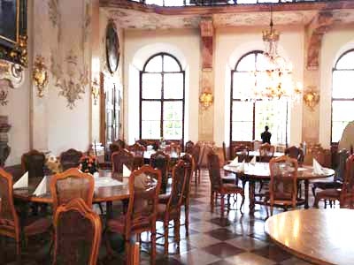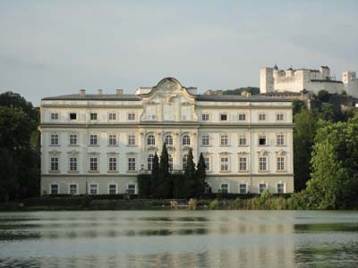 庭の前に湖があり、ここはサウンドオブミュージックのロケが行われました。湖の周りを散策できるのですが、ここからの景色は最高です。庭からは天気がよければ、ウンタースベルクの山がきれいに見えます。朝食は本館のお城の中でとることができます。駅からはちょっと遠いのですが環境はバツグン。ホーエンザルツブルク城の裏側がきれいに見えます。また、ホテルの外側には並木道があり、本当にゆったりした気分になれます。