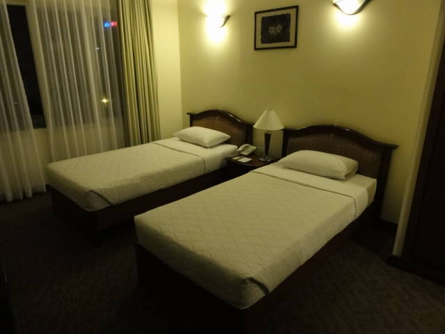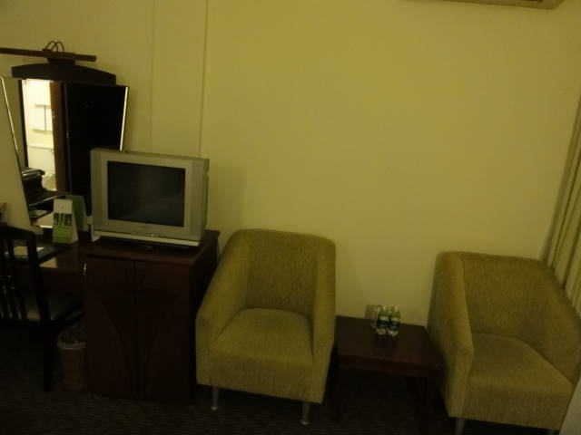 6階の客室にはシングルベッドが2つ並んでいてブラウン管テレビ・冷蔵庫・電気ポットが準備されていました。ミネラルウォータは350ccぐらいのが2本タダ。