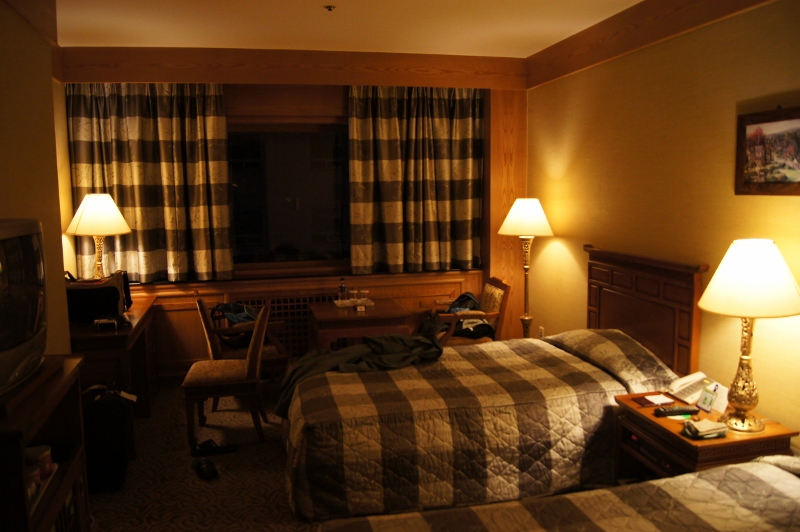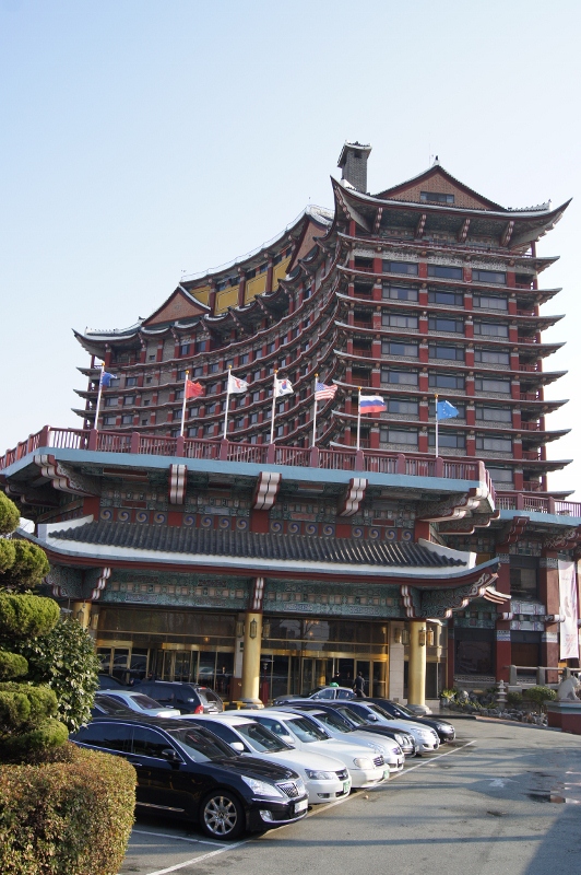 金海空港からホテルまでタクシー料金は行きが19,000W、帰りは13,200Wでした。どうやら行きは遠回りされたようです。遠くからも一目でわかる、伝統様式を模した重厚で特徴ある外観のホテルです。チャガルチ市場、釜山タワーなどの観光地から徒歩圏内ですが、丘の上に建っているため周囲は階段や坂が多く、徒歩でアクセスする場合は結構大変です。部屋は落ち着いた韓国風の内装ですが、やや暗い印象です。私が宿泊した際には日本語をしゃべれるフロントマンがおり、サービスも良好でした。