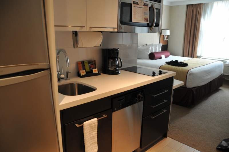 ポートオーソリティと道路を挟んで反対側にあります。部屋は広くバスタブつきで、キッチンやIHクッキングヒーター、電子レンジ、冷蔵庫、食器洗浄機などがそろい、自炊ができます。ポートオーソリティバスターミナルの中に24時間営業のスーパーがあるので、そこで食料品を買って節約していました。