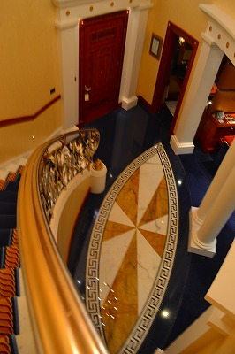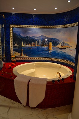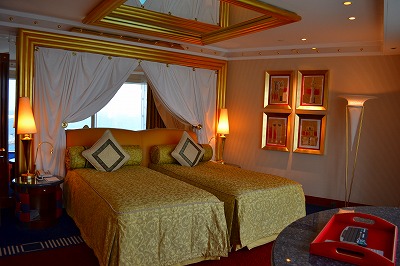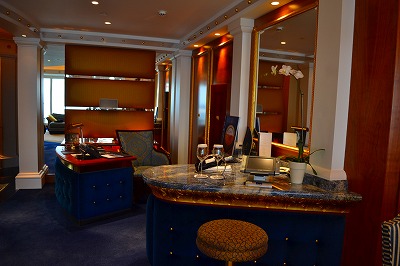 2階建てメゾネット形式の170平方メートルの広さ全室ジャグジーバス完備各部屋に専属バトラー(執事)つき。オーシャンビューデラックス スイートルームに宿泊しました。アラビア湾を望む部屋は床から天井まで一枚ガラス窓になっていてシャンプー、コンディショナー、ボディソープ、ボディローション、オードトワレなどのバスアメニティ類はすべてエルメスのフルボトル!常に補充されるウェルカムフルーツのほかに夕方カットフルーツとウェルカムシャンパンのワゴンサービス、バーにはウェルカムドリンクの赤ワインボトル、アラビアンクッキーの詰め合わせもありました。夕食や夜の外出から戻ると1泊目は靴磨きとシミ抜きセットが、二泊目は男女別アロマハンドピーリングがベッドの上に置かれ、足元にはスリッパとミネラルウオーターが置かれていました。