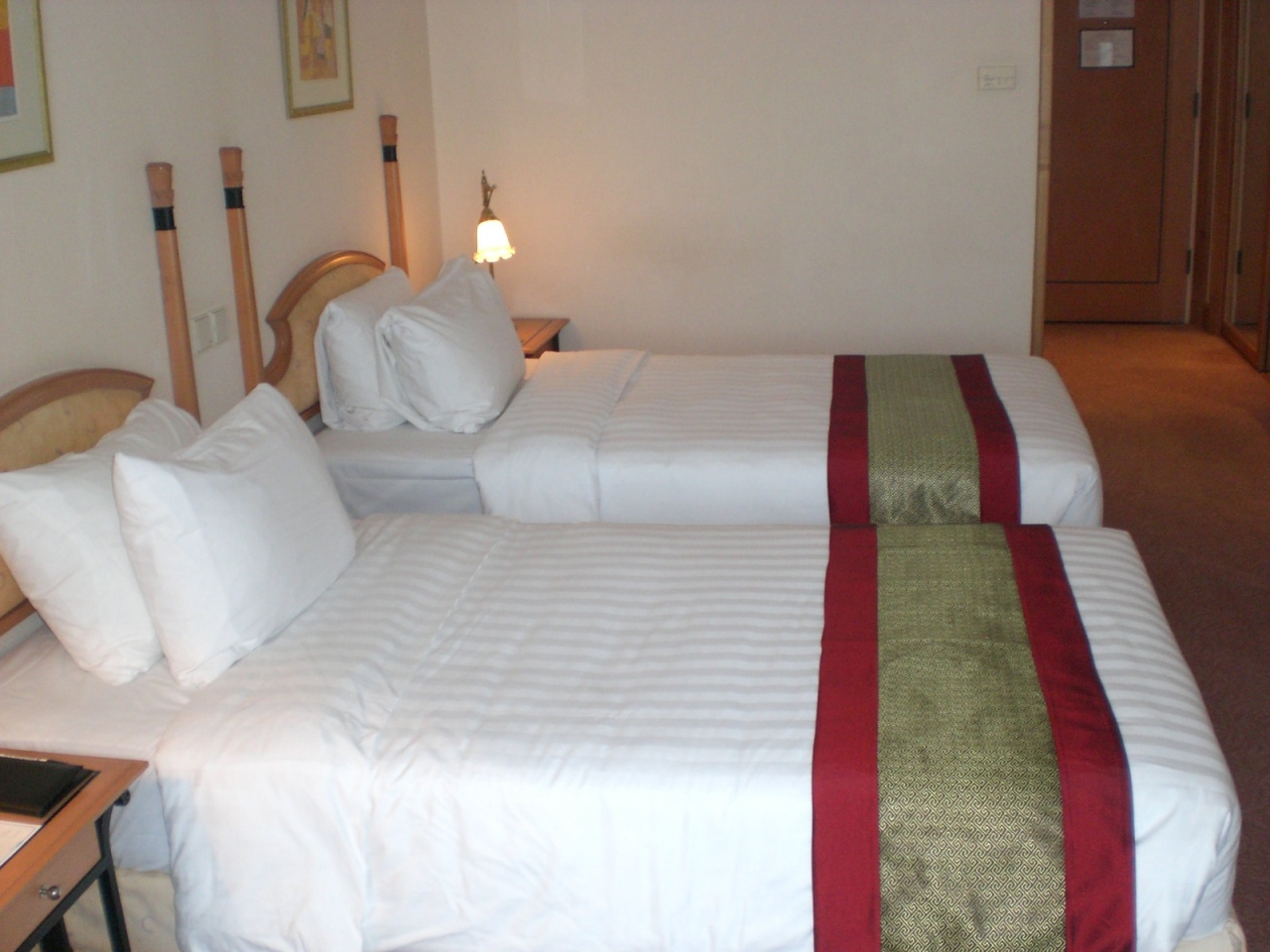 客室は、ツインタイプでバスタブがあり、体重計も備え付けられていました。ホテルの付近には、日本食の店も結構ありました。