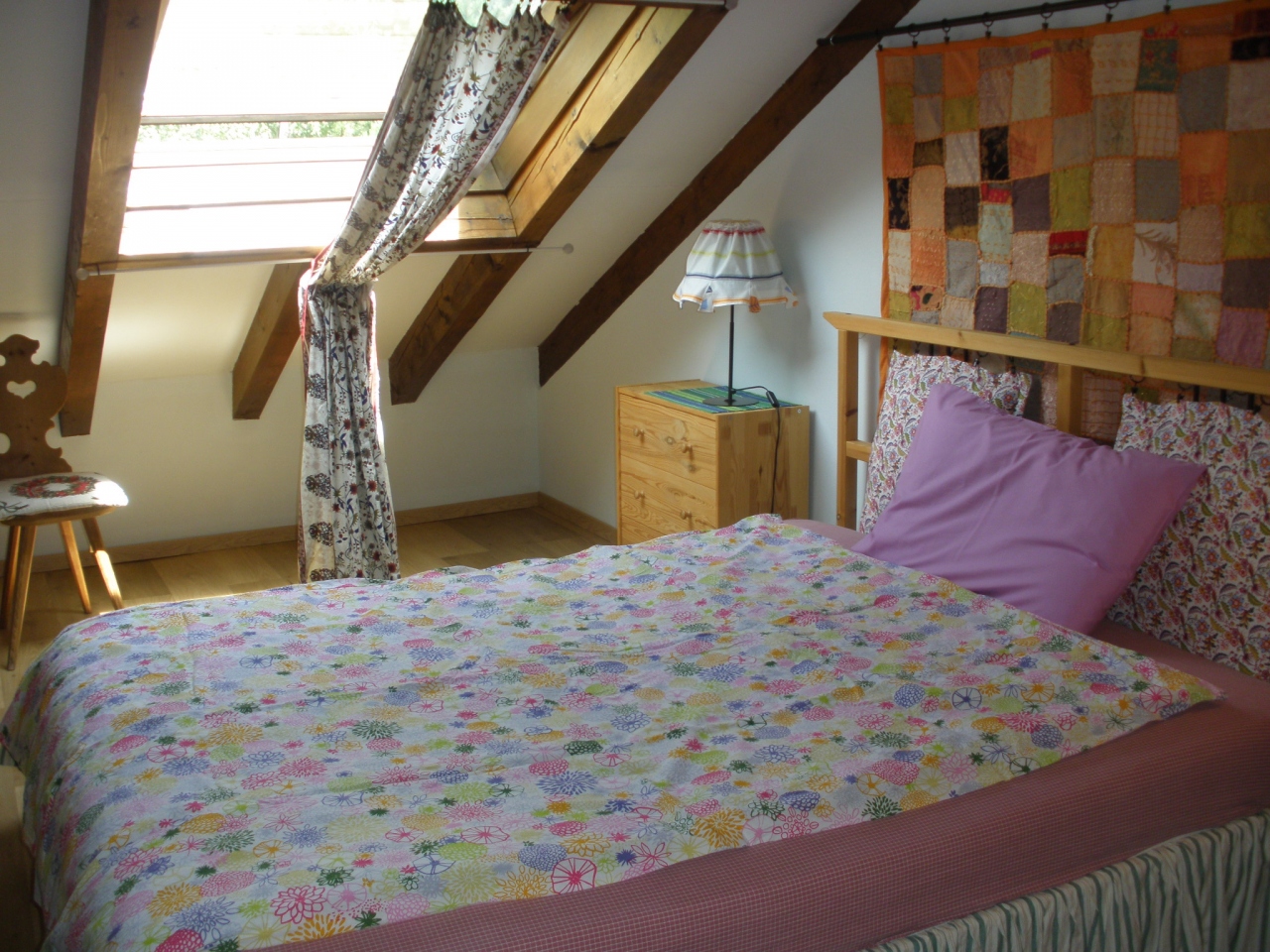 ダブルベッドで天井が斜めになっていて、斜めにある窓が日の光を取り入れてくれとっても明るく、スーツケース広げっ放しでも充分な広さがありました。