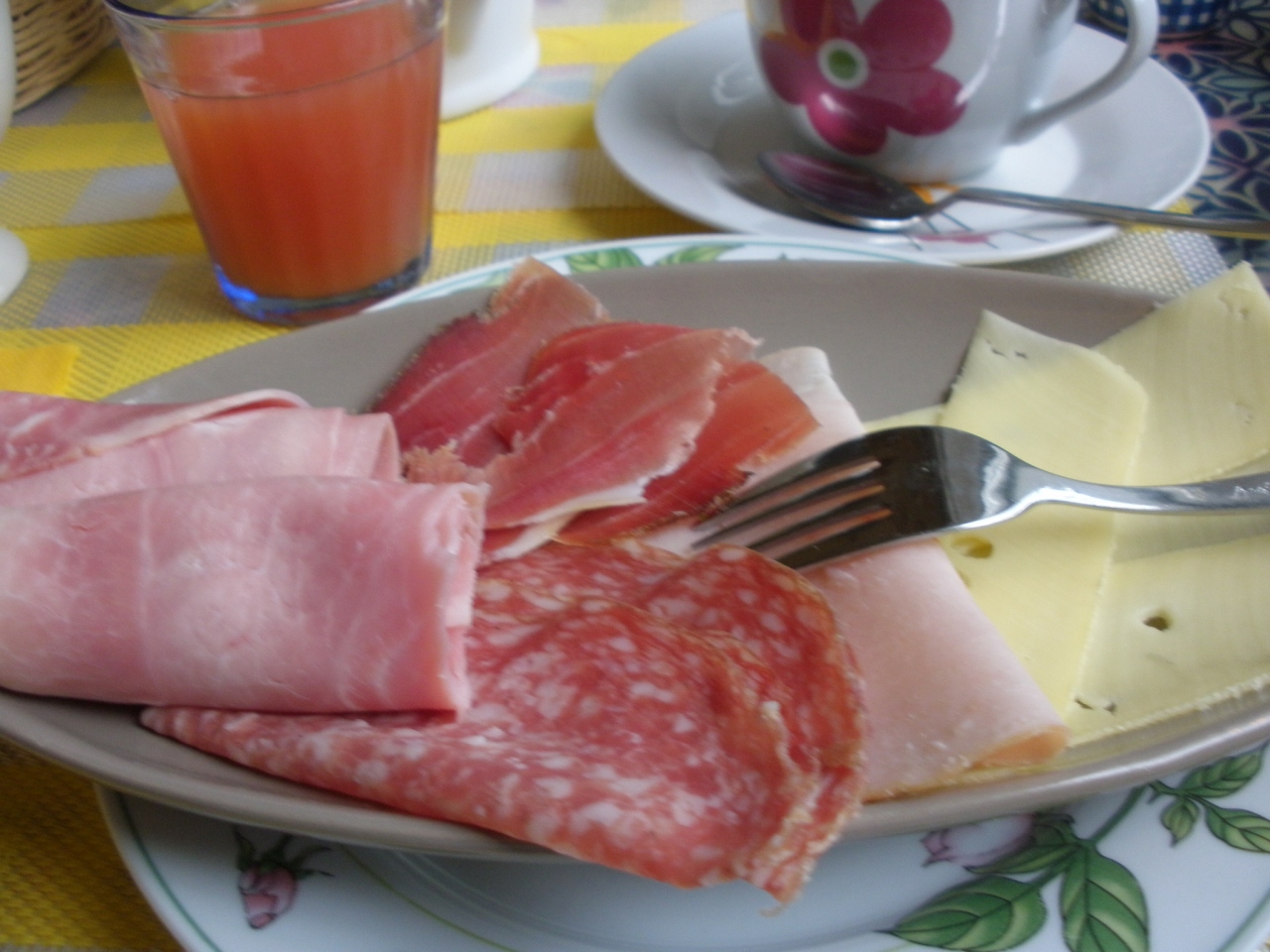 朝食は、8:00~10:00ですが、希望を聞いて、7:00からでも快く用意してくださいました。ハム&チーズを数種類ずつ盛り付けてコーヒーとジュースと共にテーブルに持って来てくださいます。シリアル類やヨーグルトは自分で選んできます。クッキーもありました。