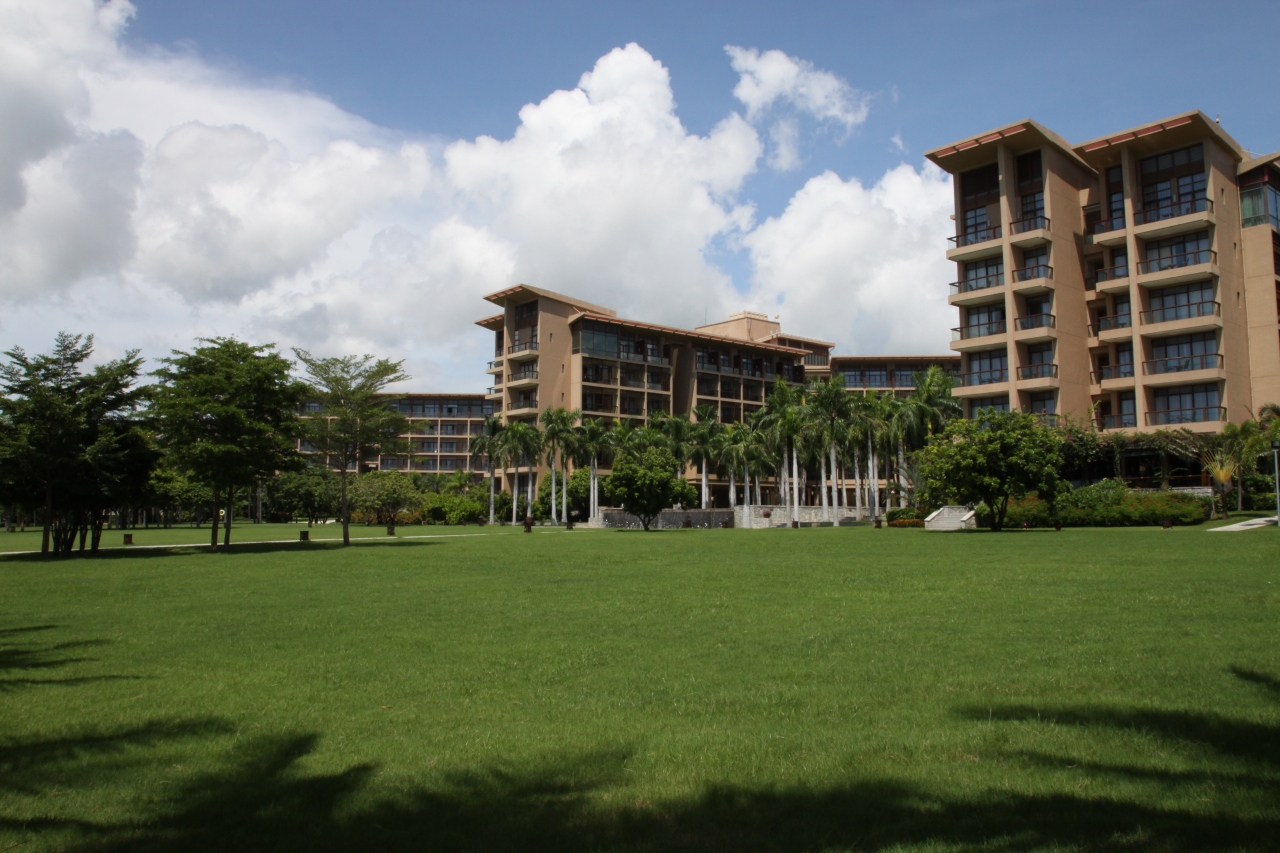 海南島の亜龍湾のほぼ真ん中にあります。最近、亜龍湾にはリッツやシェラトンなどの外資系ホテルがどんどんできて、なんかこのホテルは目立たなくなっていますが、いやなかなかの素晴らしいホテルです。部屋はみんな広いし、ホテルの庭も広大できれいし、白い花が咲き乱れて本当に美しかったです。レストランはタイ料理が非常に美味しかったです。