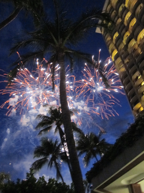 写真は、毎週金曜日に、目の前のビーチから打ち上げられる花火。日本の花火大会とくらべれば一瞬ですが、気分が盛り上がります!