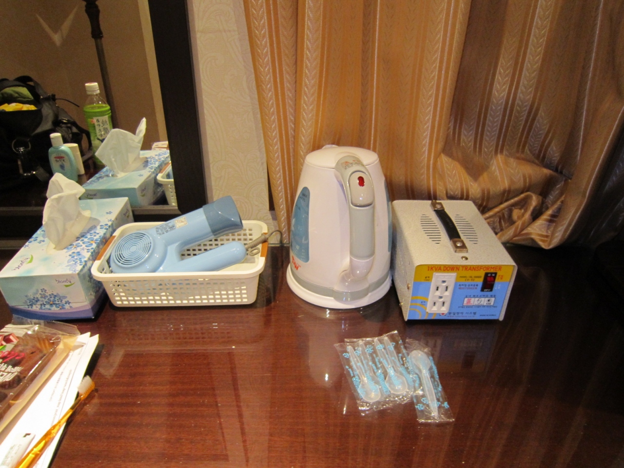 部屋は701号室。ツインの部屋で、キングサイズのベッドが1つとシングルベッドが1つ。思ったよりも広く、テレビ、変圧器、小型の冷蔵庫、ポットが備えられてました。ハンガーも2本しかなかったので、南大門のダイソーで購入。金庫もありましたが、カギがかかっており利用できませんでした。フロントに聞いたところ、貴重品はフロントへ預けてほしいといわれました。(事務用袋に封をしてくれるようです)