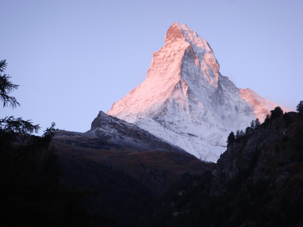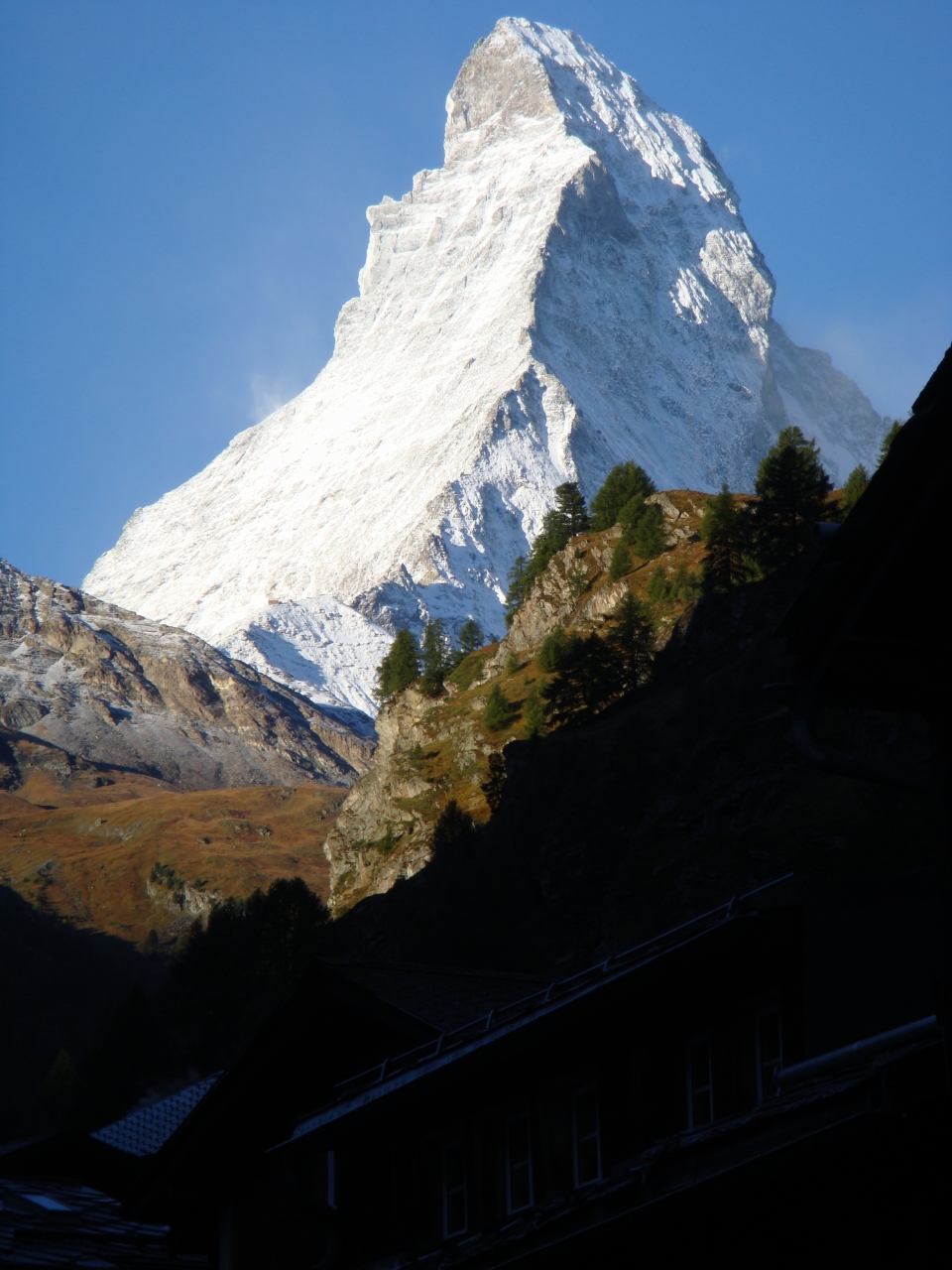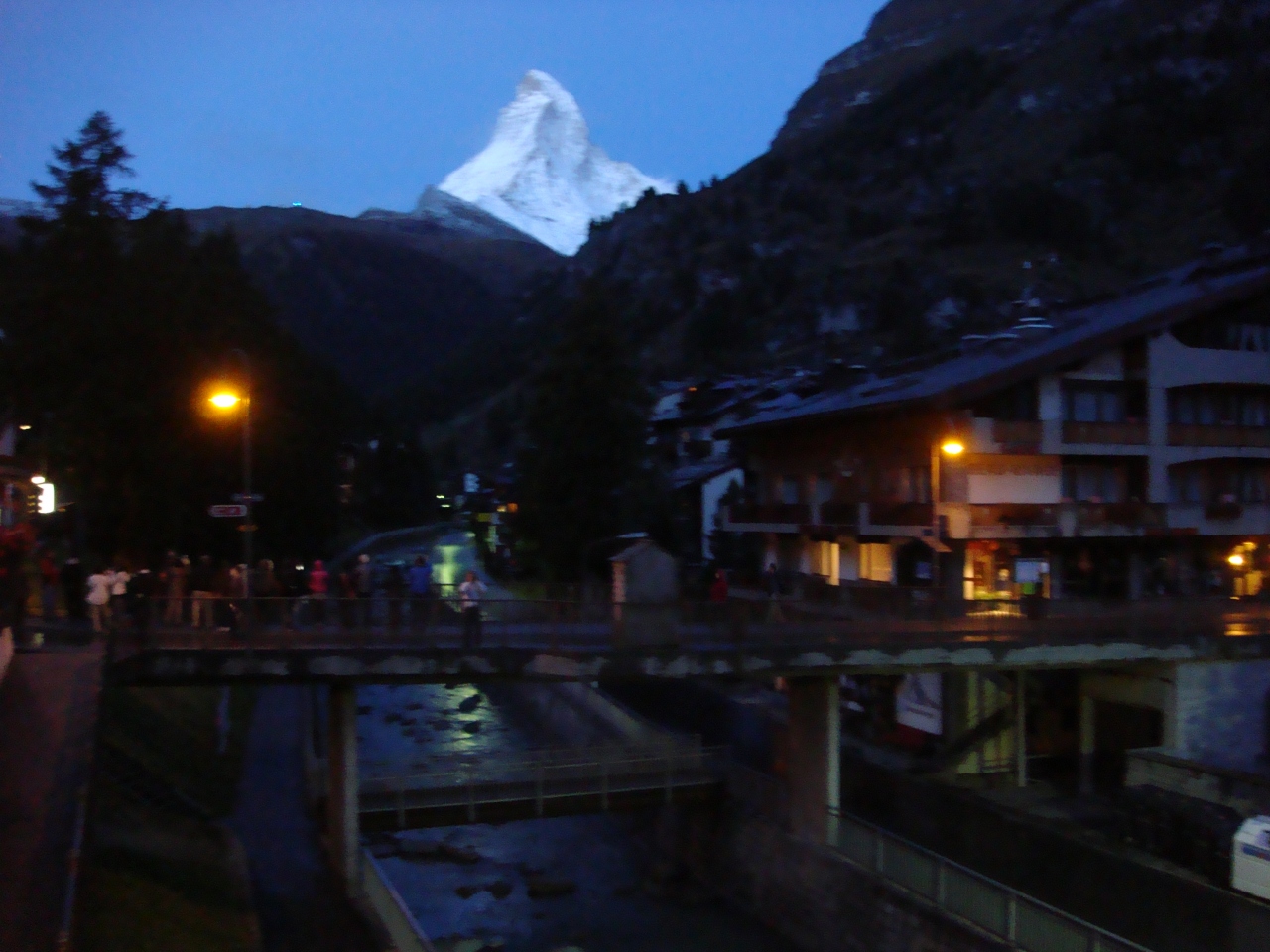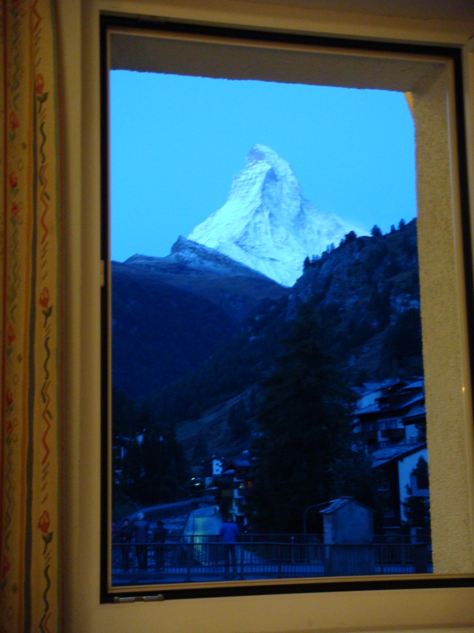 事実、ゴルナグラートへ上がった日は、天候が悪く山々には雲がかかり、強風が吹き、屋外では風景を楽しむような状況ではなかった。カフェでチョコレートミルクを飲んでスゴスゴと降りてきた。ところが翌日、6時半ごろ窓のカーテンを開けると暗闇の中にうす白い山影が見えるではないか!窓から時間の経つごとにその色を変えてゆくマッターホルンを存分に見て、撮影できた。