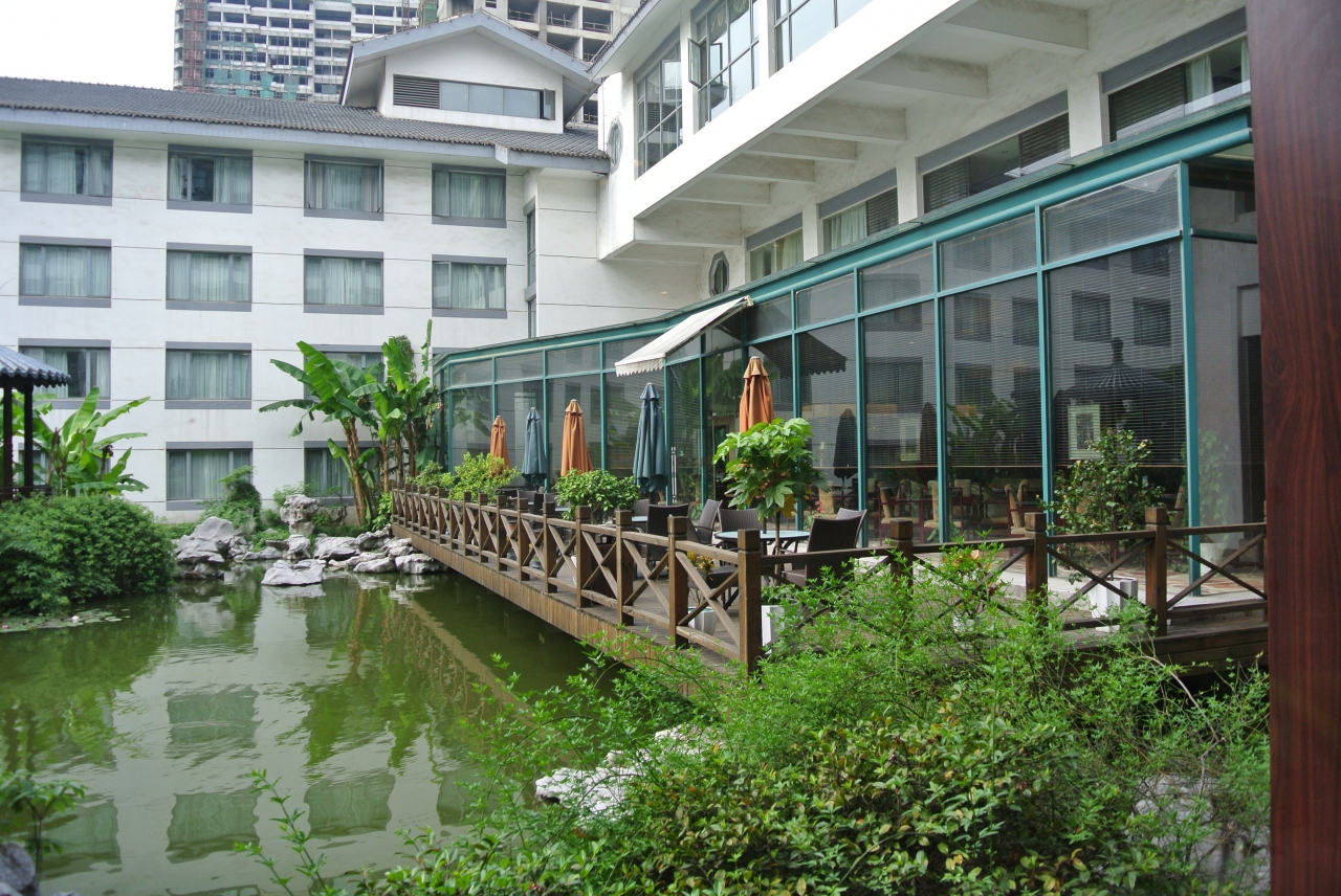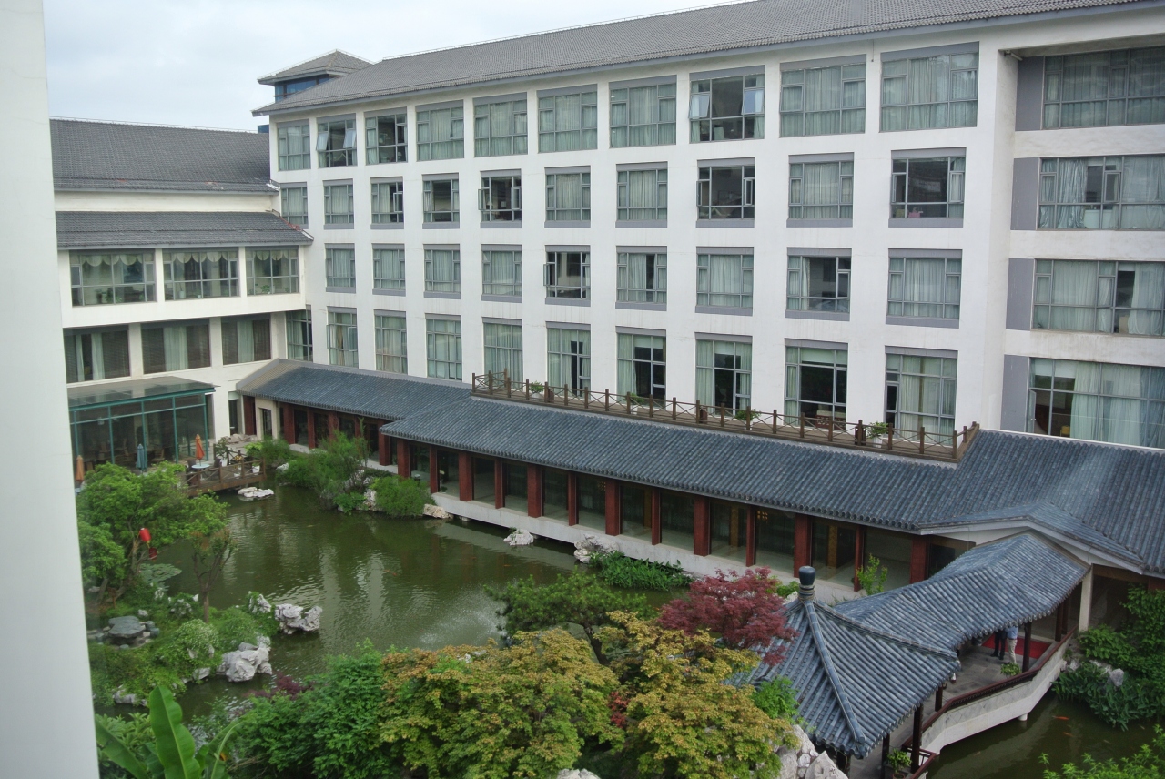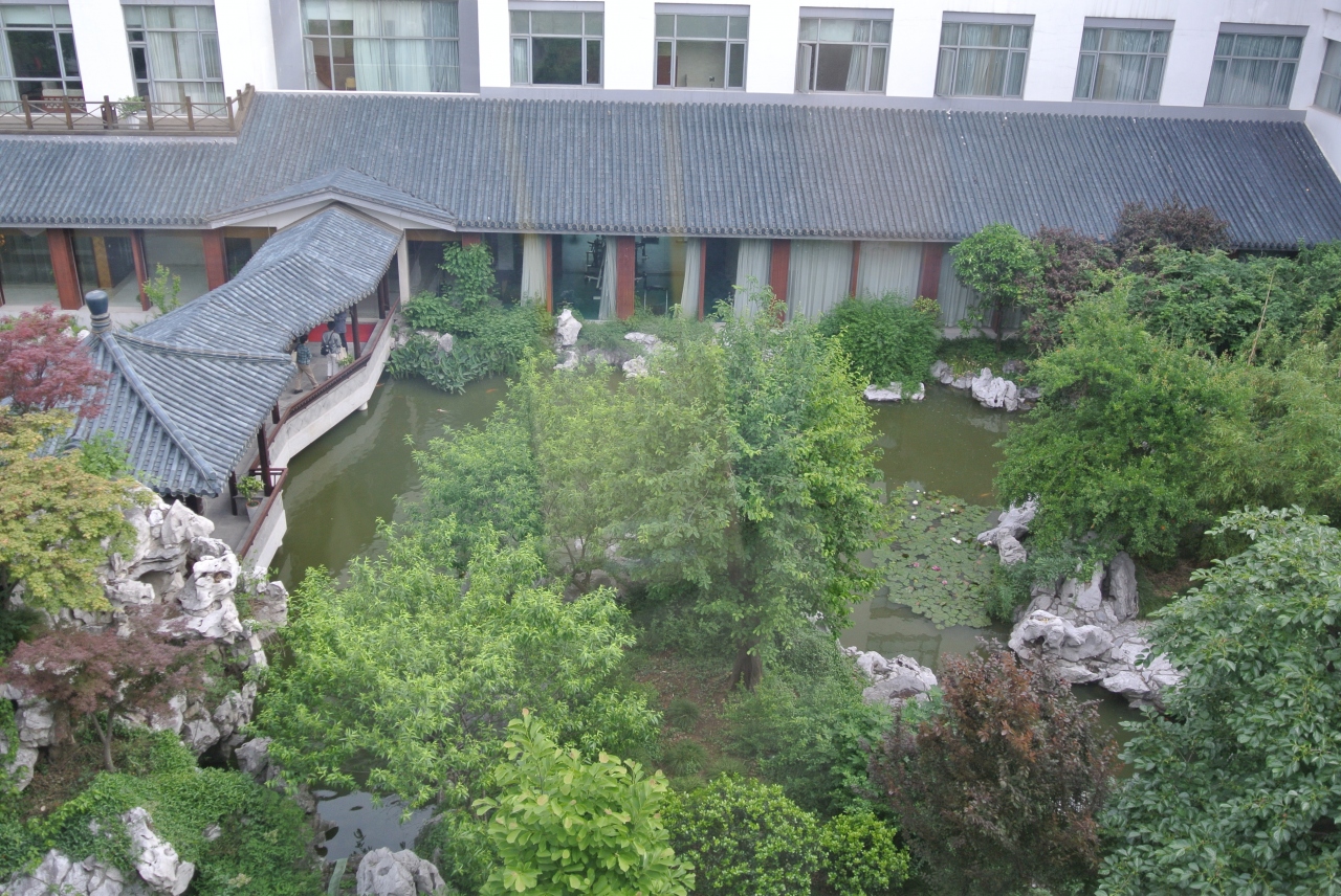ホテルに中庭が有り、池を配した回遊式の庭園となっています。部屋は広く、バスルームが部屋から見通せます(写真参照)<割合大きめのホテルでしたので、団体の利用が多そうです。ホテルは街の中心地からは少し離れており、いわゆる蘇州の観光地からは遠くなっています。