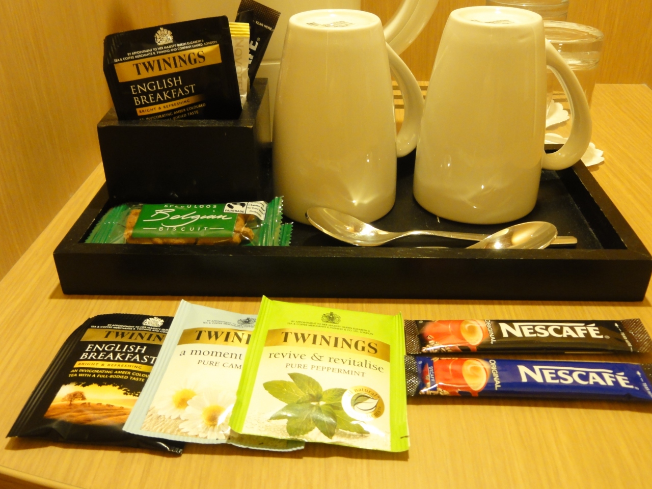 ■クローゼットにアイロンとアイロン台があった。無料の飲み物等は、紅茶・コーヒー・ビスケットがあった。