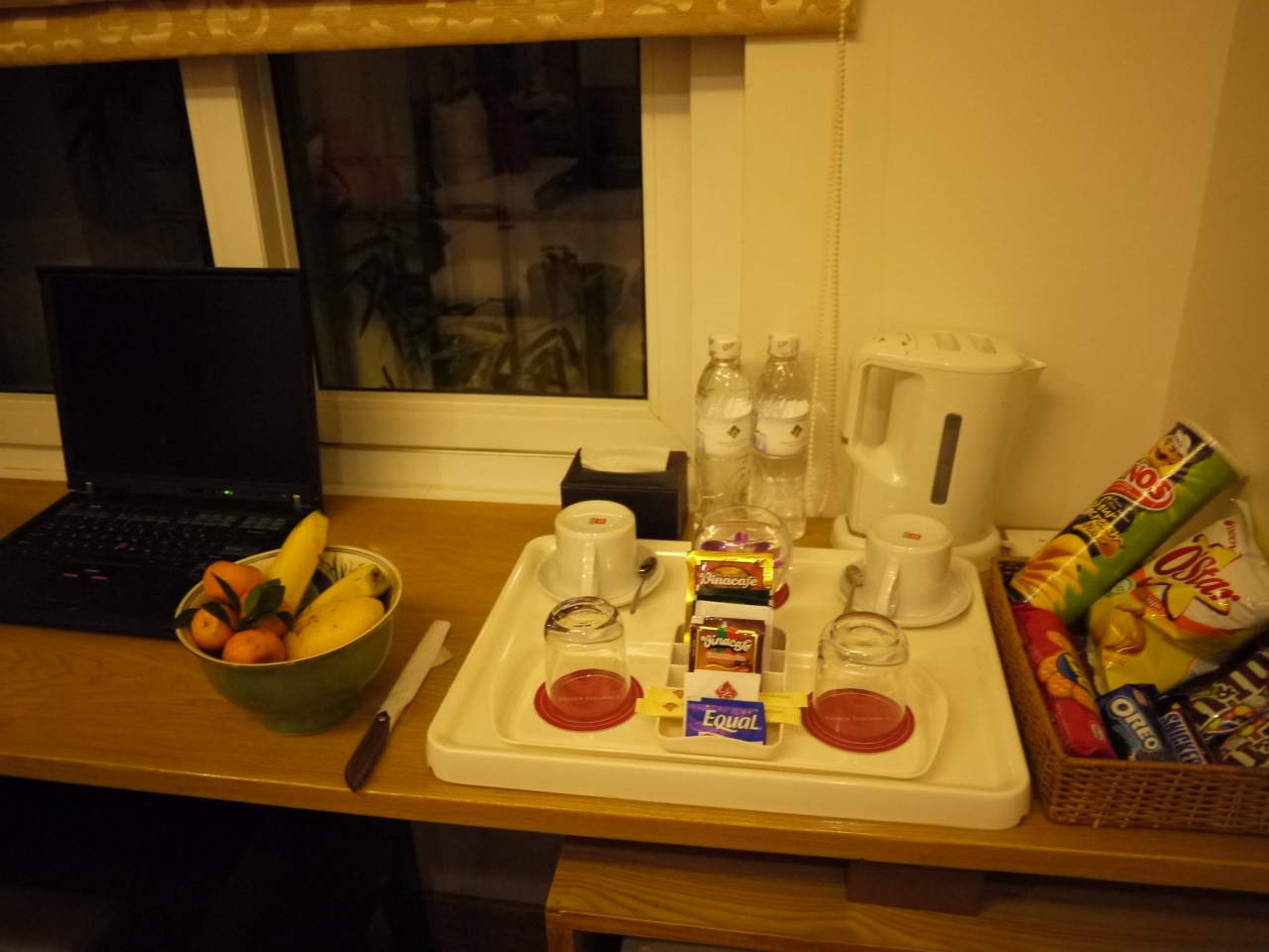 部屋には無料で使えるノートパソコン、無料のミネラルウォーター(これもホテルオリジナルロゴ入り)が毎日2本、ウェルカム果物の盛り合わせも無料であり、暗証番号で閉められるセーフティボックスあり、おまけに傘(またもやホテルロゴ入り)や体重計までありました。