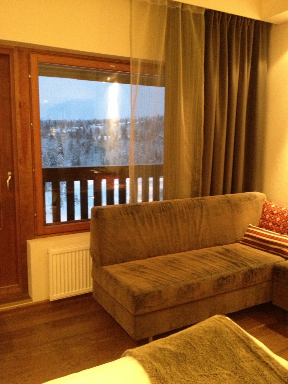 私が宿泊した部屋は5階だったので窓からの景色がとてもきれいでした。バルコニーがあり、椅子も置いてあるのでここで暖かい飲み物を飲みながら北極圏の森を眺める事もできます。(冬は寒いですが)