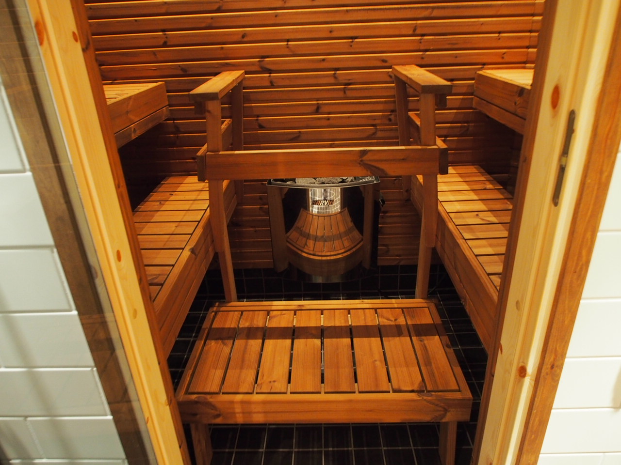 バスルームは、床のタイルが黒でシックな内装で、4畳くらいの広さがあったように思います。また中にさらにドアがあり、開けてみるとサウナルームになっていました。