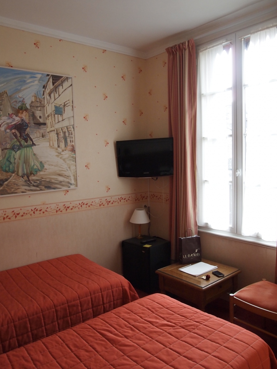 部屋は狭いしホテル内は階段しかないので、スーツケースはどこかに置いてくるのがお薦めです。私は前の日にレンヌに泊まり、そこのホテルにスーツケースを預けて行きましたが正解でした。