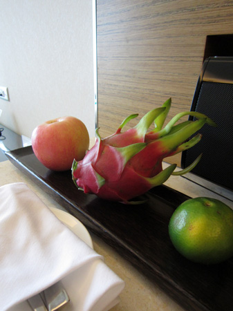 お部屋はシックなインテリアで広く、チェアなど調度品も素敵でした。iPodのドックがついたプレーヤーも有り、ウエルカムフルーツも3種類も♪