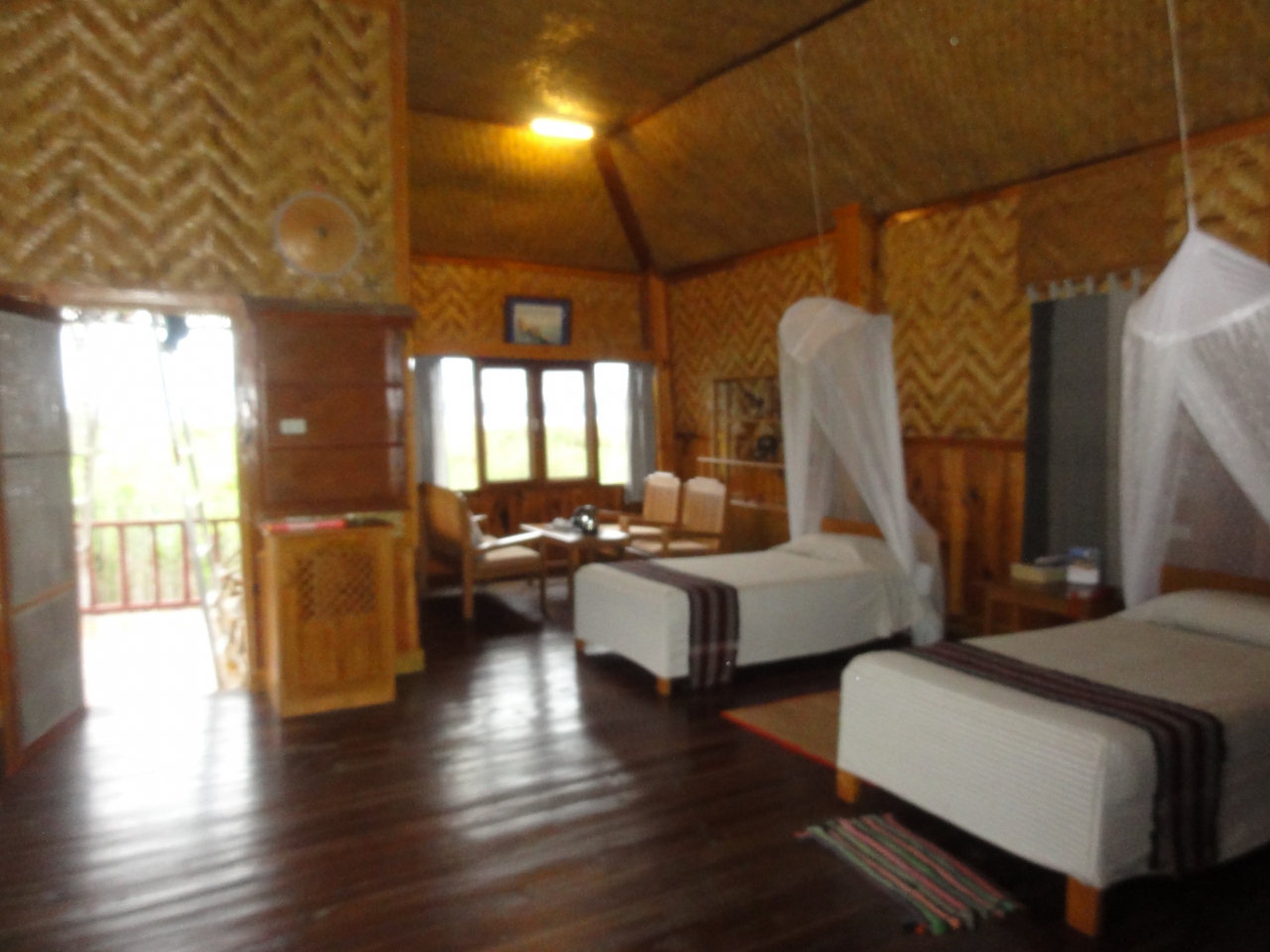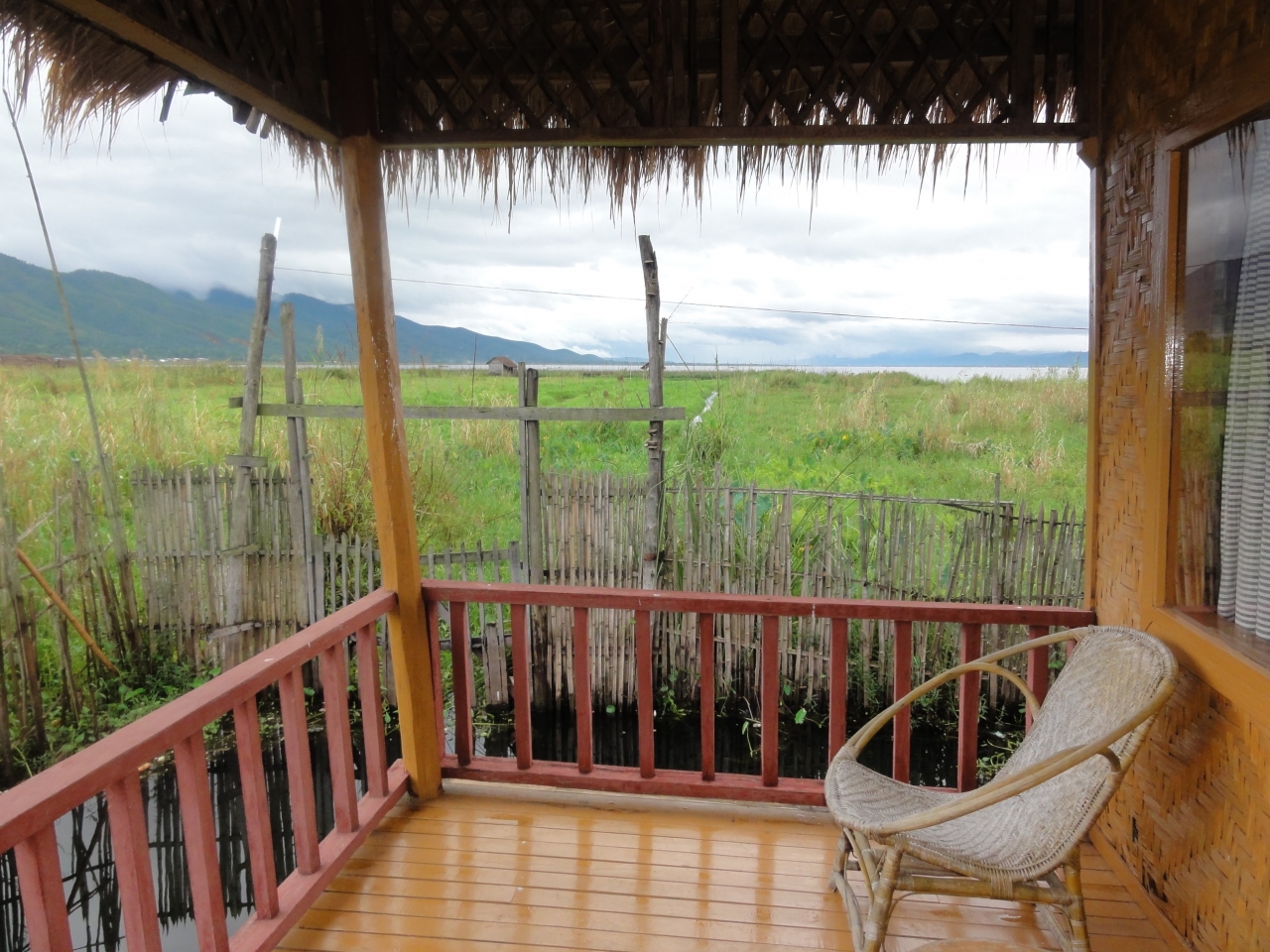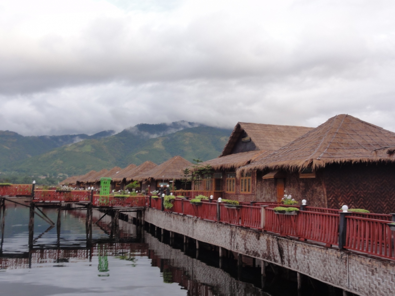 インレー湖に浮かぶ水上コテージホテルです。ホテルへのアクセスも水上からのボートのみ、はるか遠くの地に来た雰囲気です。すべて竹や木組みのつくりで水上デッキが各コテージをつないでいる。部屋は十分な広さとテラスもある。バスルームも広いがお湯の出が少なくてすぐに濁った水になってしまう。水上というロケーションでしかたないか。