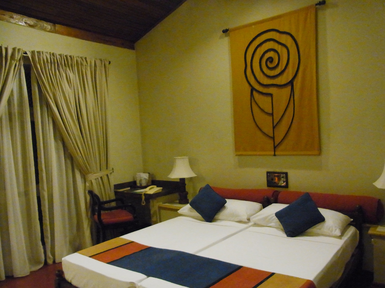 一泊一室約12000円で宿泊。近くにあるシギリヤ・ヴィレッジと迷ったが、コテージタイプの部屋があまり好きではないのと、プールから眺めるシギリヤ・ロックの写真を見てこちらに決めました。夕食はホテルのビュッフェを利用しました。ビュッフェ二人分+ドリンク二杯で4300ルピーでカード払い可。種類豊富でおいしかったです。この日は満月の日だったのですが、お酒は×とのことでした。部屋は飾り気はないし古めかしく、この値段の割にはイマイチでした。アーユルヴェーダマッサージもできますが、当日だとフル・ブッキングでだめでした。