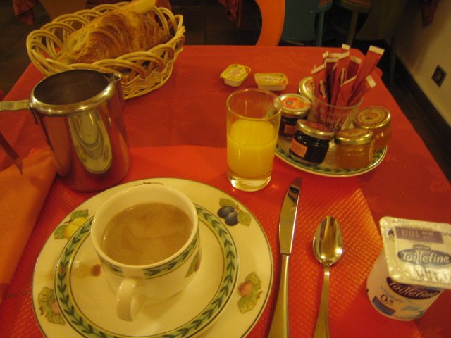 ボードレールホテルは、パリの日本食レストラン等の多い場所にあります。十時やとブックオフ書店が一番近いかな。地下に荷物置き場と朝食スペースがあります。朝食は、クロワッサン、バゲット、ジャム、ヨーグルト、オレンジジュース。マダムにテ(紅茶)orカフェ(コーヒー)orショコラ(ココア)と聞かれどれかを選びます。12ユーロ。客室はスーツケースを広げられるくらいのスペースはあります。