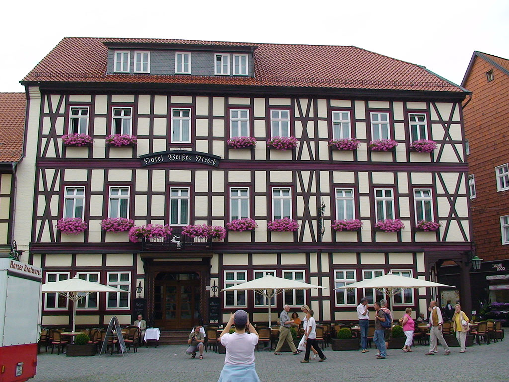 童話の絵本に出てくるようなかわいらしい木組みの家を利用したホテルです。マルクト広場の市庁舎の斜め前にあります。市庁舎の素晴らしい建物や木組みの家が立ち並ぶマルクト広場の様子を窓から眺められるというのは、それだけでもドイツの風情たっぷりでお勧め。1階のレストランのお料理も美味しく、インテリアもシックで素敵でした。