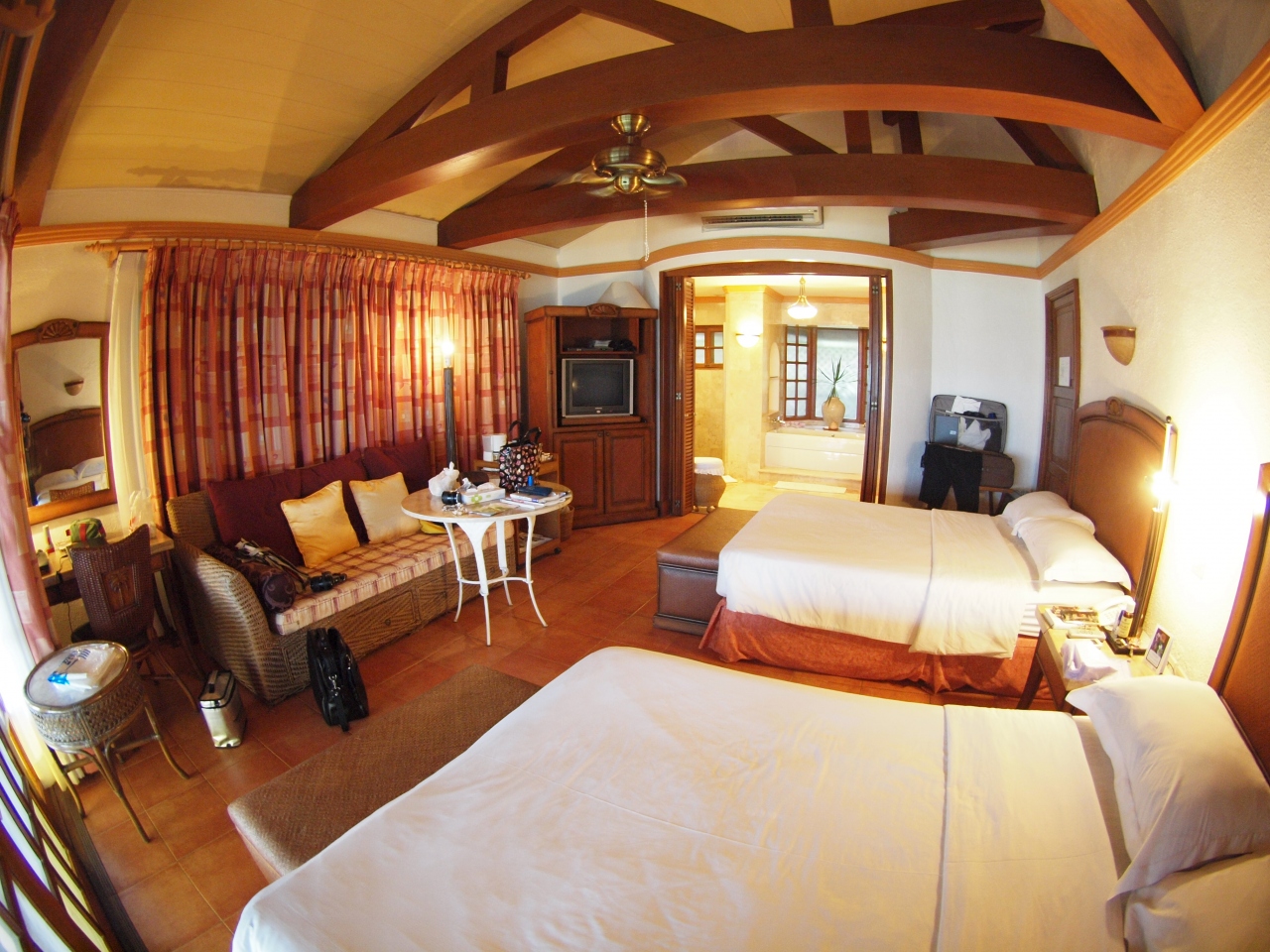 高台に建っているので、芝生のガーデンからは海が見渡せましたが、リゾート自体が若干東向きになっているようで日中の部屋の中は明るくありません。