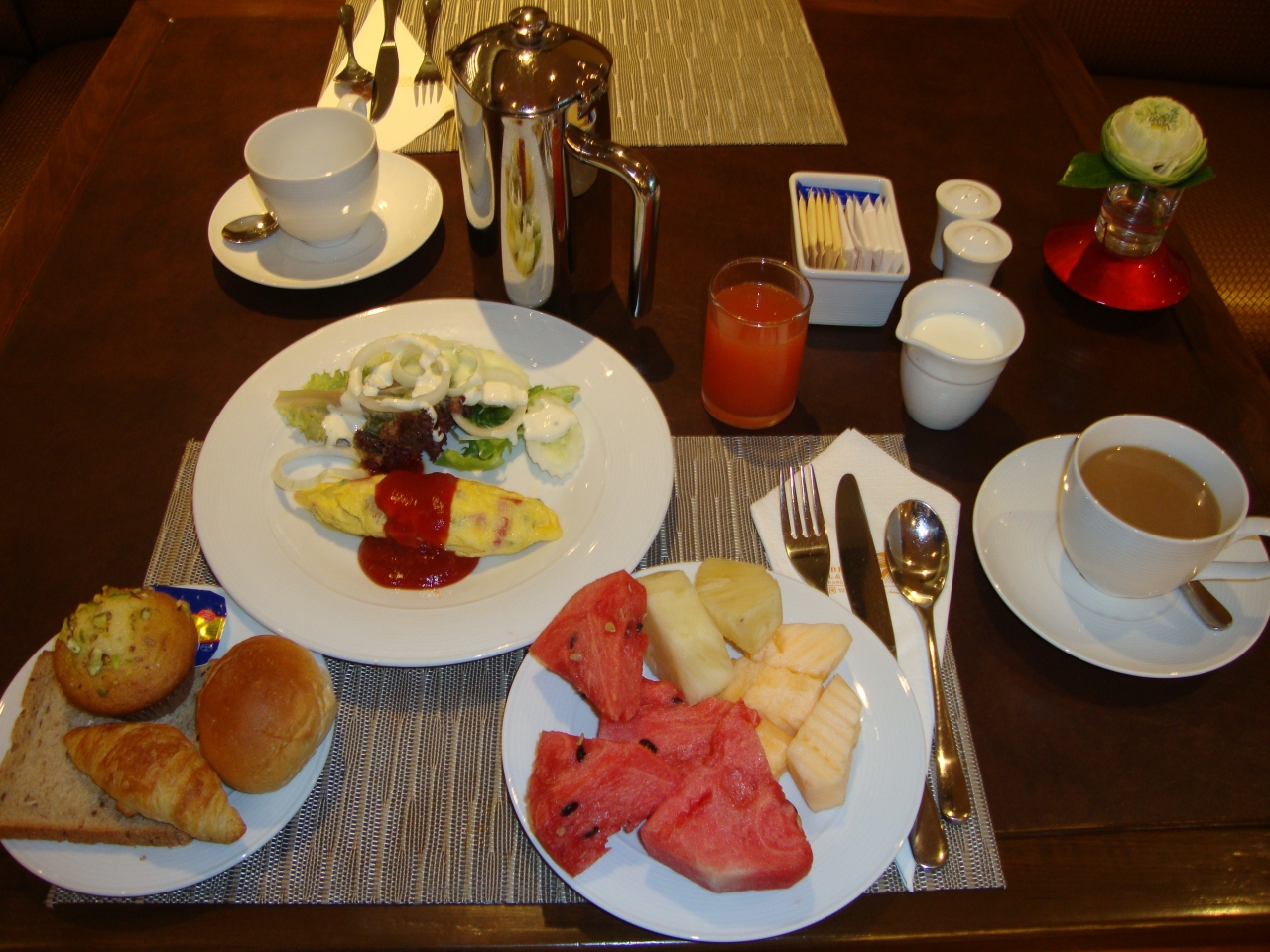 朝食のビュッフェはオムレツとフルーツとパンは美味しかったです。